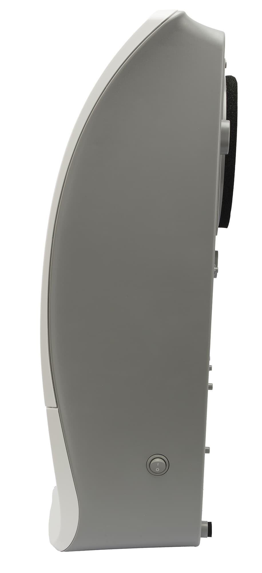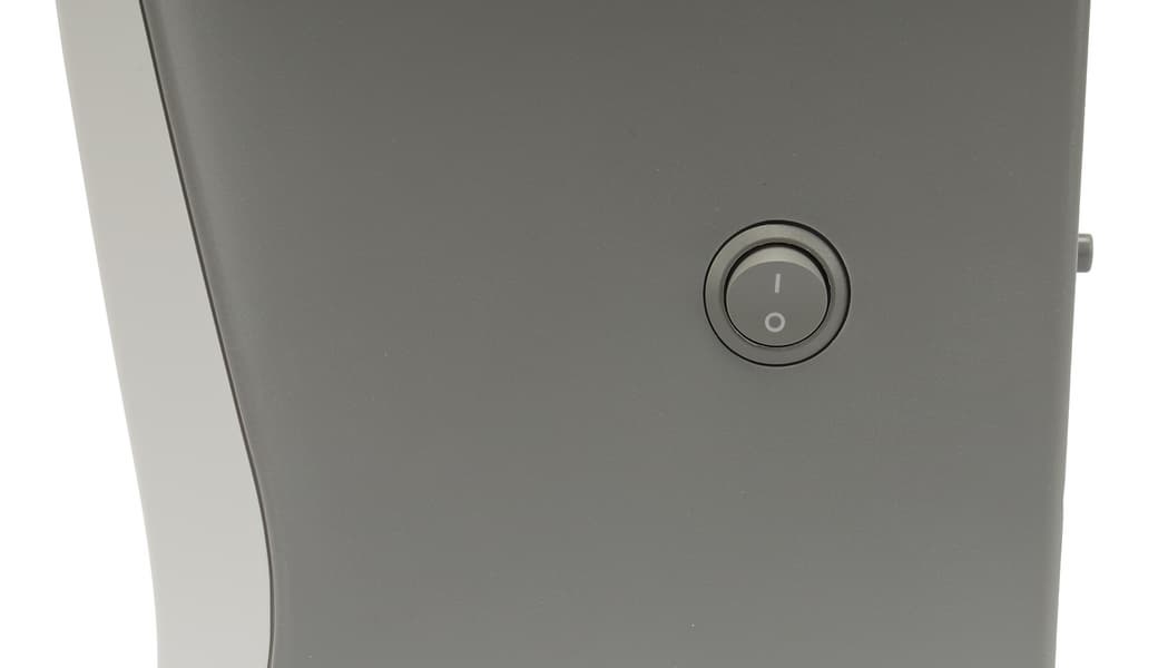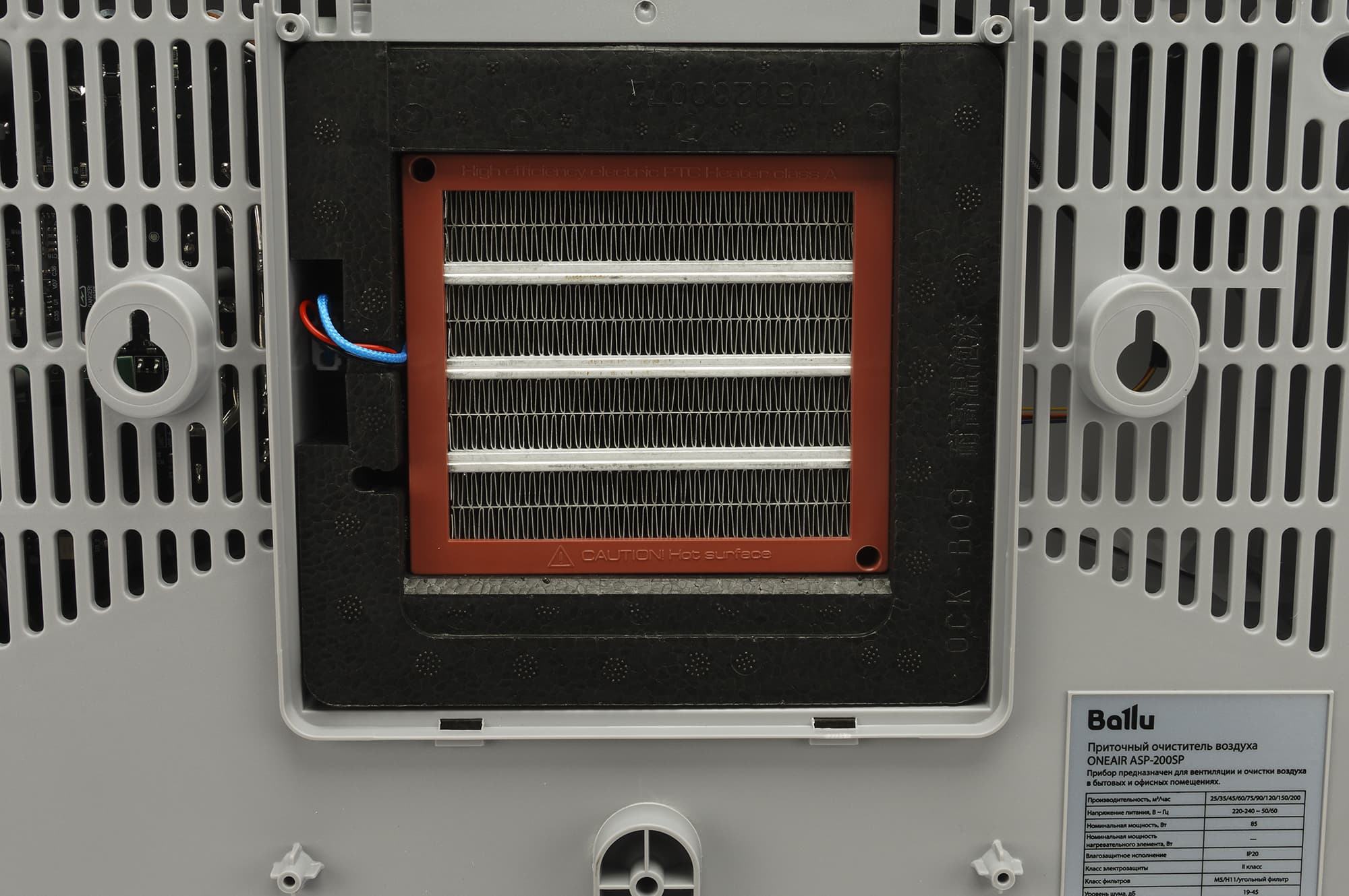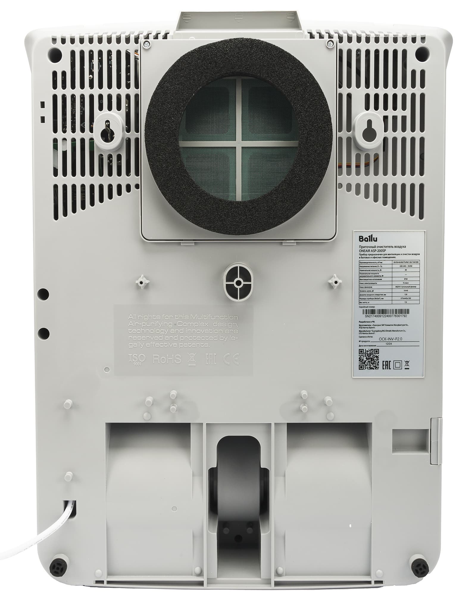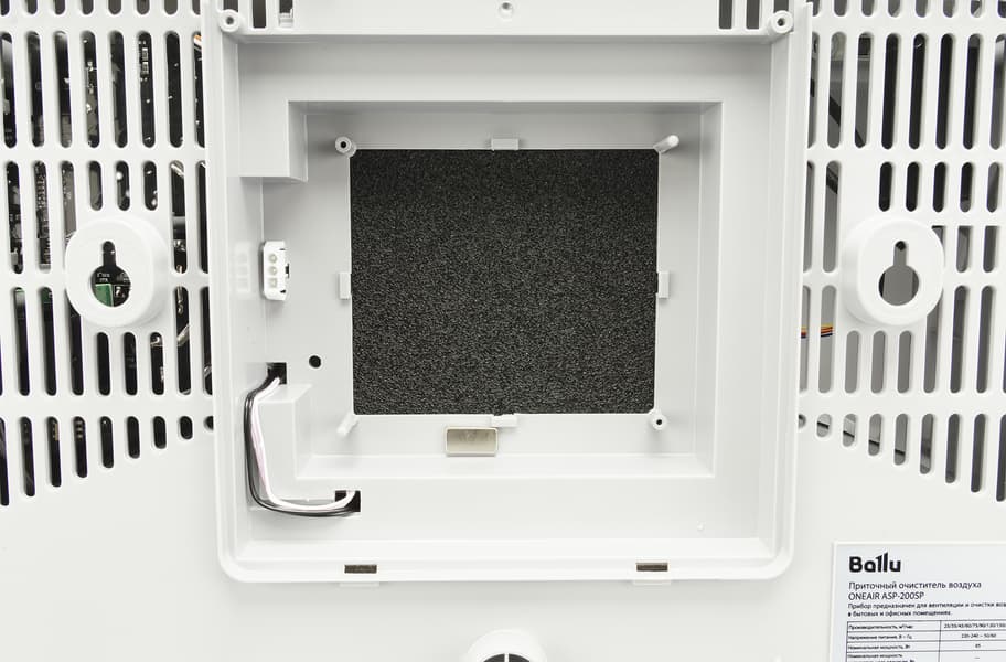 На правом боку размещен круглый выключатель питания. В отличие от большинства подобных устройств, Ballu OneAir ASP-200 размещается не вплотную к стене: сверху он опирается на прокладку воздухозаборного отверстия, а снизу — на две небольшие ножки, снабженные демпферами из пористой резины.
