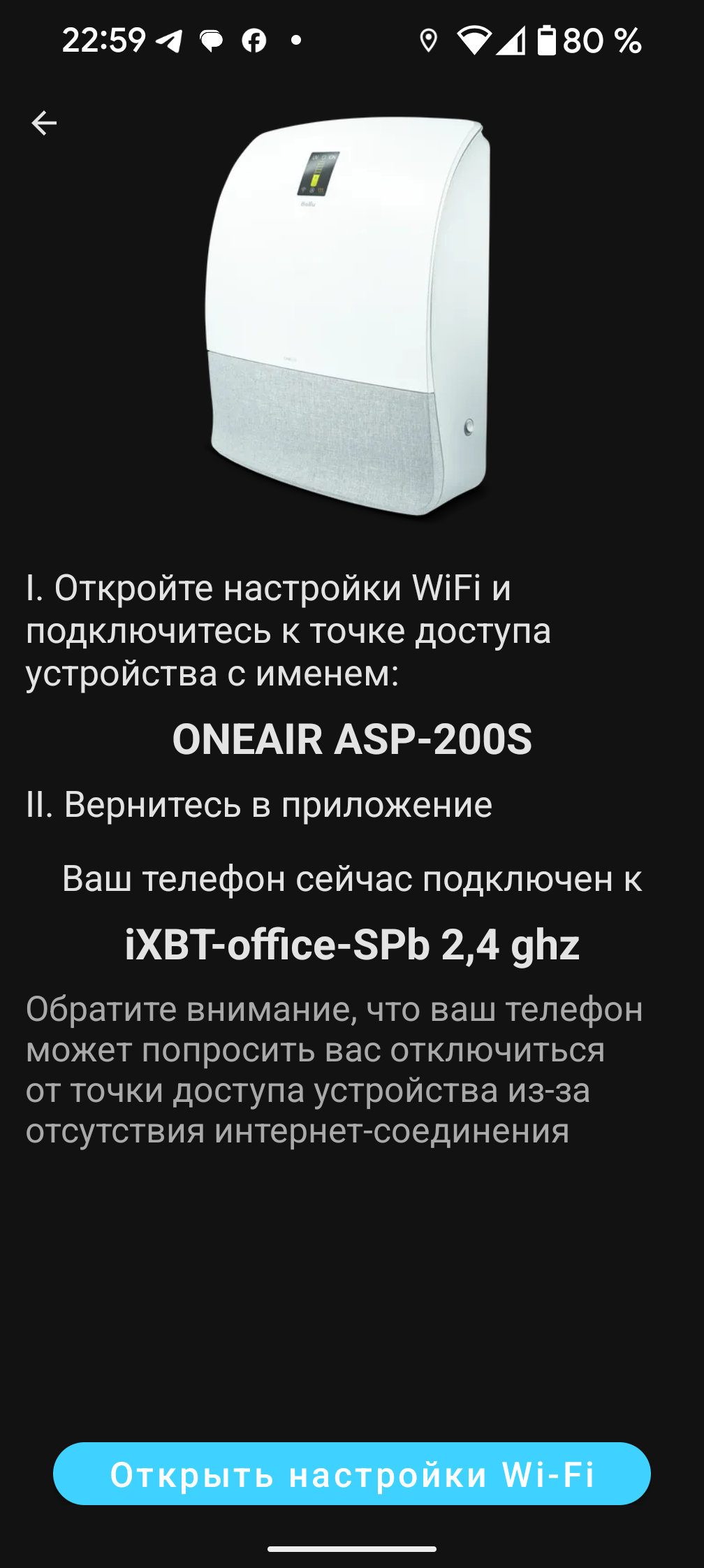 После этого на главном экране можно воспользоваться кнопкой «Добавить устройство» (значок в виде плюса в правом верхнем углу). Приложение автоматически обнаруживает готовый к подключению OneAir ASP-200. После этого там требуется ввести данные нашей беспроводной сети, переключиться на временную сетку, созданную прибором, и следовать дальнейшим инструкциям.