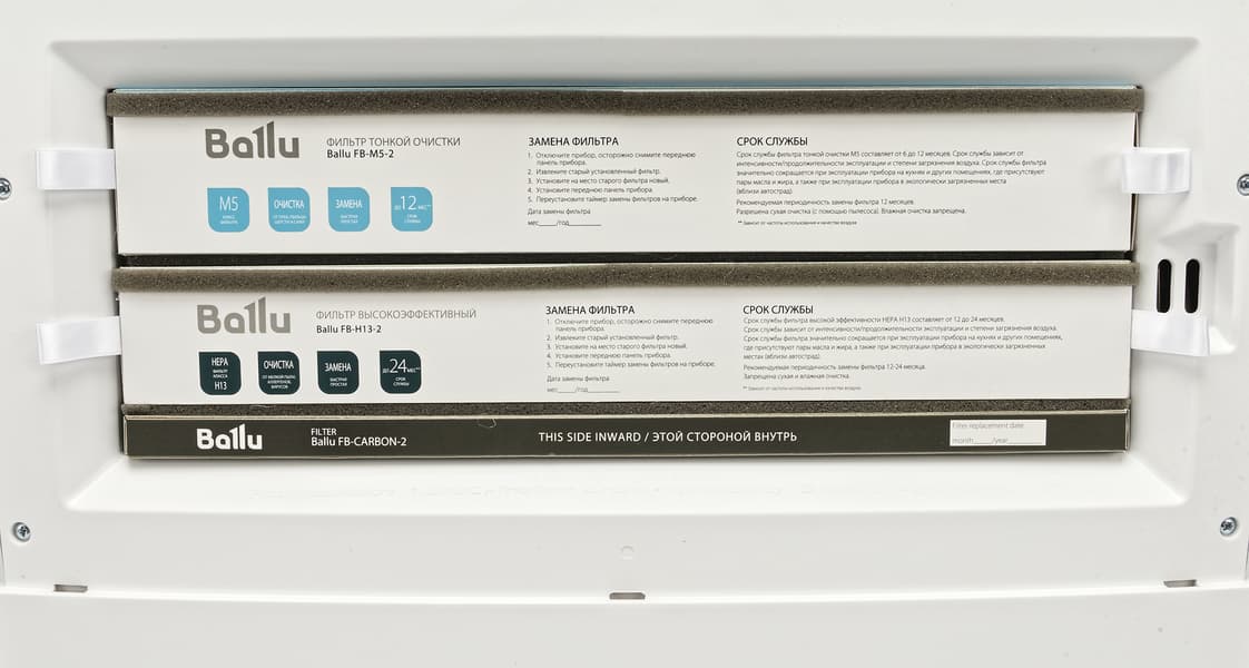 Остальные фильтры следует заменять на новые в соответствии с регламентом обслуживания и в зависимости от условий использования: фильтр тонкой очистки — раз в полгода-год, HEPA-фильтр FB-H13-2 — раз в год-два, а угольный фильтр FB-CARBON-2 — примерно раз в год. Все расходные материалы доступны на сайте производителя.