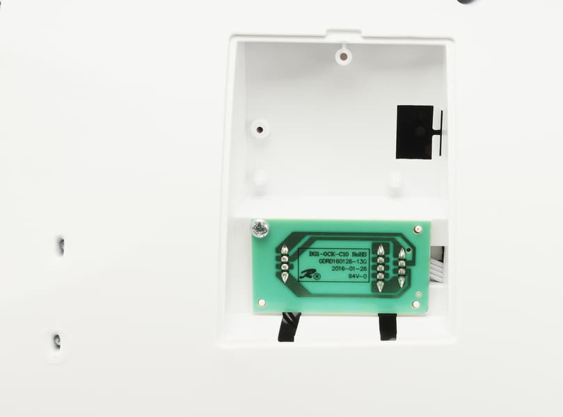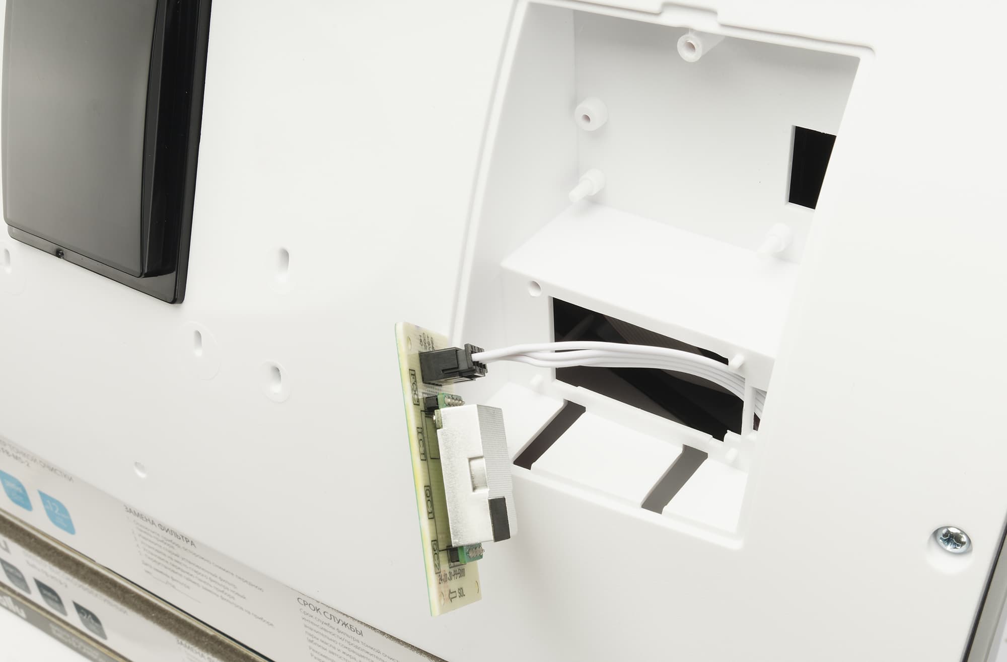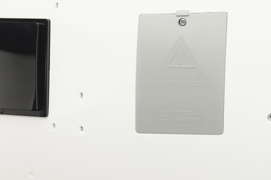 Для установки модуля не требуется демонтаж со стены: к его отсеку можно получить доступ, сняв переднюю стенку. Посадочное место закрыто серой крышкой с надписью «Wi-Fi module and CO₂ sensor», зафиксированной винтом.