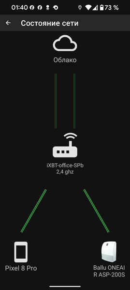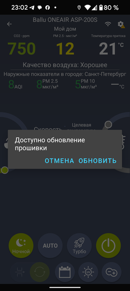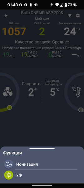 На главном экране приложение отображает температуру воздуха на впускном отверстии, показания встроенного сенсора PM2.5 и установленную скорость вращения вентилятора. Если добавленный нами модуль датчика углекислого газа корректно распознался системой, в верхнем левом углу отображаются его показания, а при наличии нагревательного элемента система позволяет выставить целевую температуру воздуха. Также мы видим здесь информацию о состоянии атмосферы в нашем населенном пункте: их приложение получает из внешних источников, используя данные о местоположении смартфона.