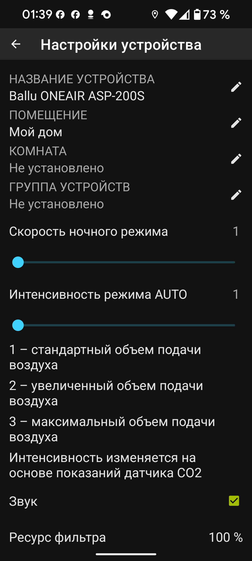 В настройках устройства мы можем переименовать его и помещение, в котором оно установлено, настроить минимальную скорость вентилятора для ночного и автоматического режимов, включить или выключить подтверждающие звуки, ознакомиться с оставшимся ресурсом фильтра, поделиться правами управления с членами семьи и проверить наличие обновлений встроенного программного обеспечения.