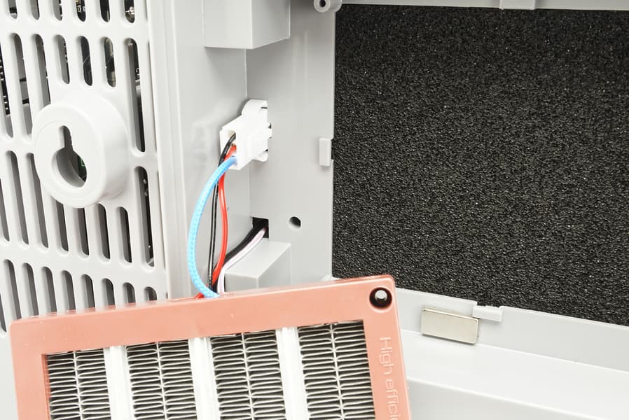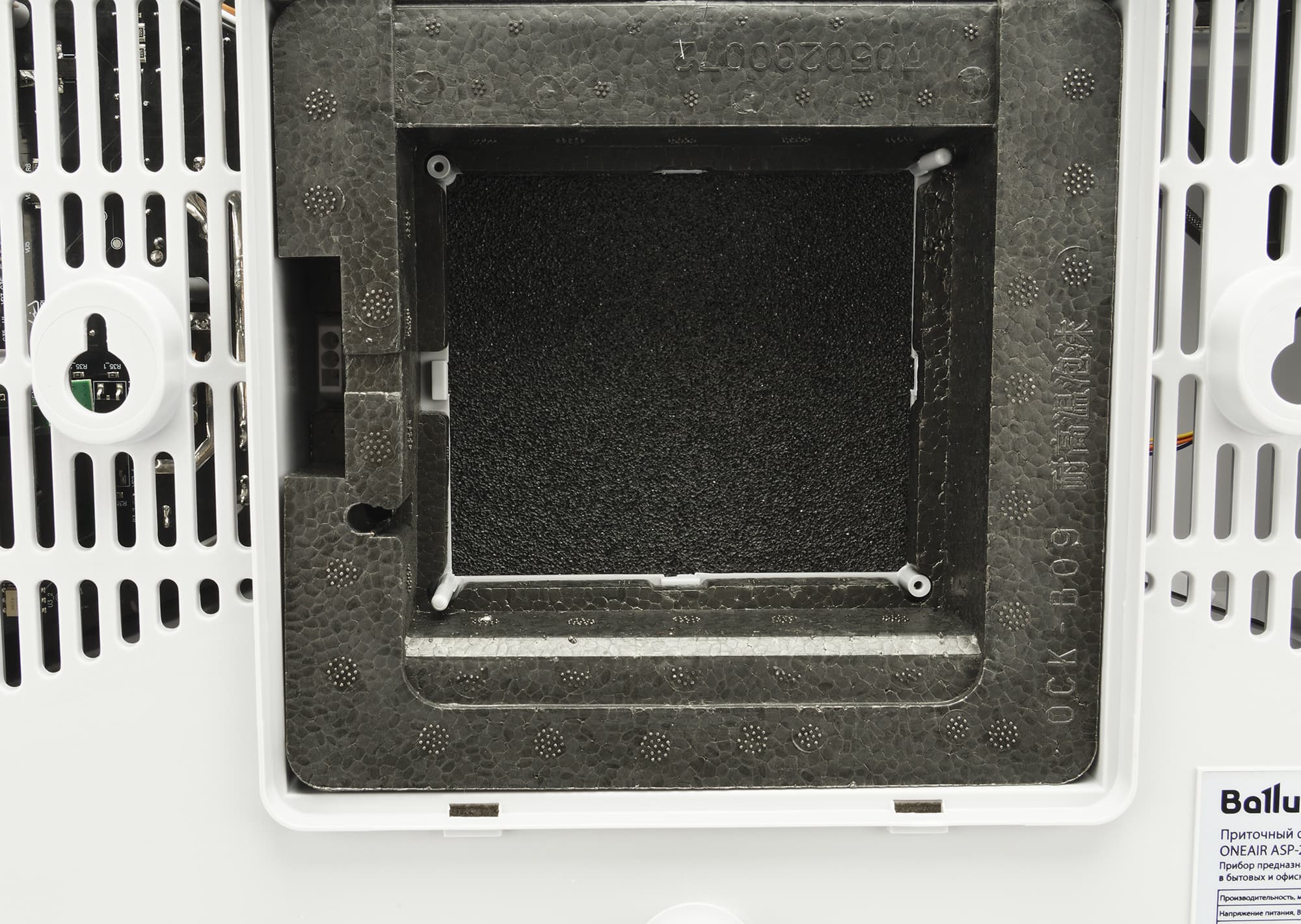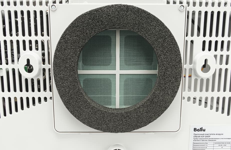 Во впускном отверстии мы видим сетку предварительного фильтра, защищающего устройство от насекомых, мусора и крупной пыли с улицы: это первая ступень очистки. Справа и слева располагаются вентиляционные решетки для охлаждения внутренних компонентов. Через них же поступает воздух, если устройство работает в режиме рециркуляции.
