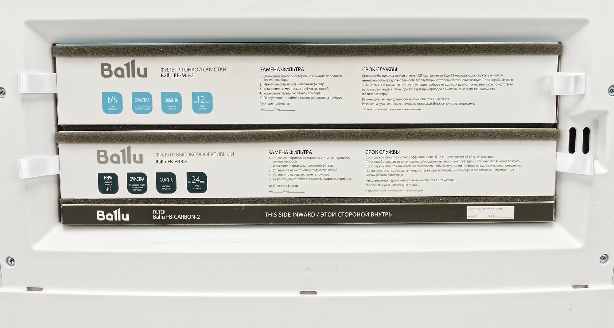 За тонкую очистку отвечает картридж Ballu FB-M5-2. Его основная задача — задерживать мелкую пыль, прошедшую сквозь сетку предварительного фильтра. Срок службы элемента составляет, в зависимости от условий и интенсивности эксплуатации, от 6 до 12 месяцев.