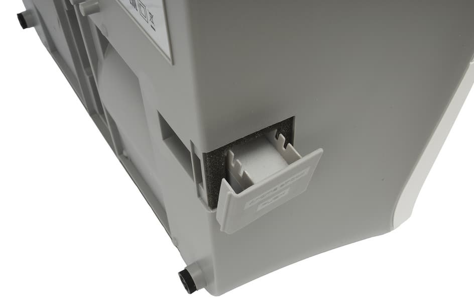 Большую часть передней панели занимает съемная крышка отсека фильтров. Нижняя четверть объединена с корпусом сделана из того же белого пластика, что и крышка: этим устройство отличается от сфотографированного для упаковки.