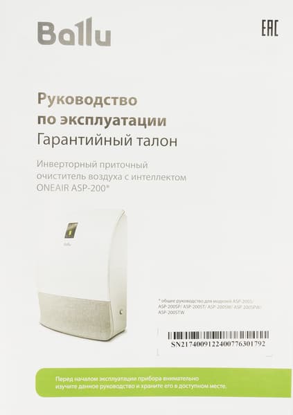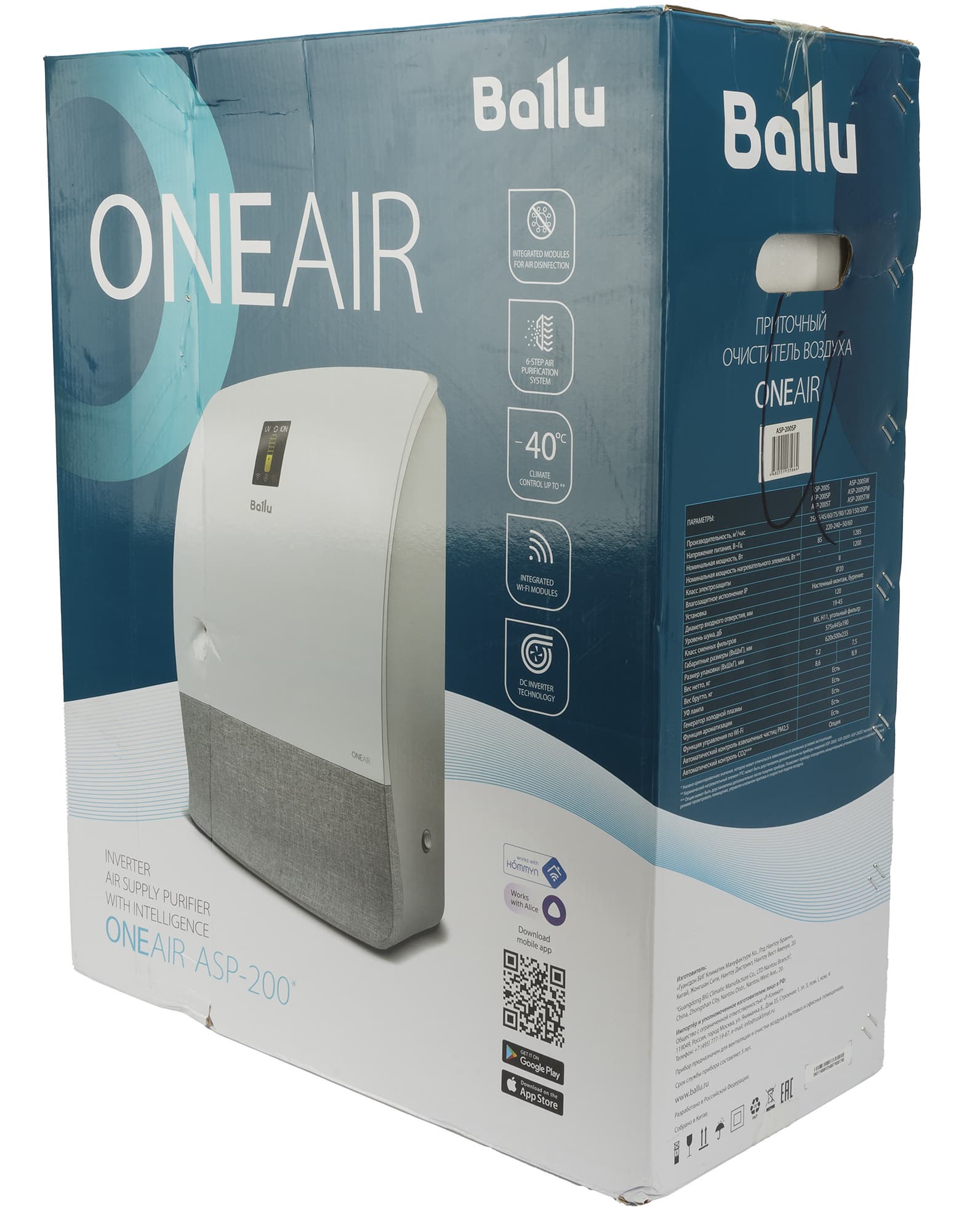 Ballu OneAir ASP-200 поставляется в большой картонной коробке с полноцветной печатью. На передней стороне упаковки производитель разместил цветное фото прибора. Как мы увидим чуть позднее, изображение устройства слегка отличается от реальности: дизайн разработан сразу для двух сходных моделей.