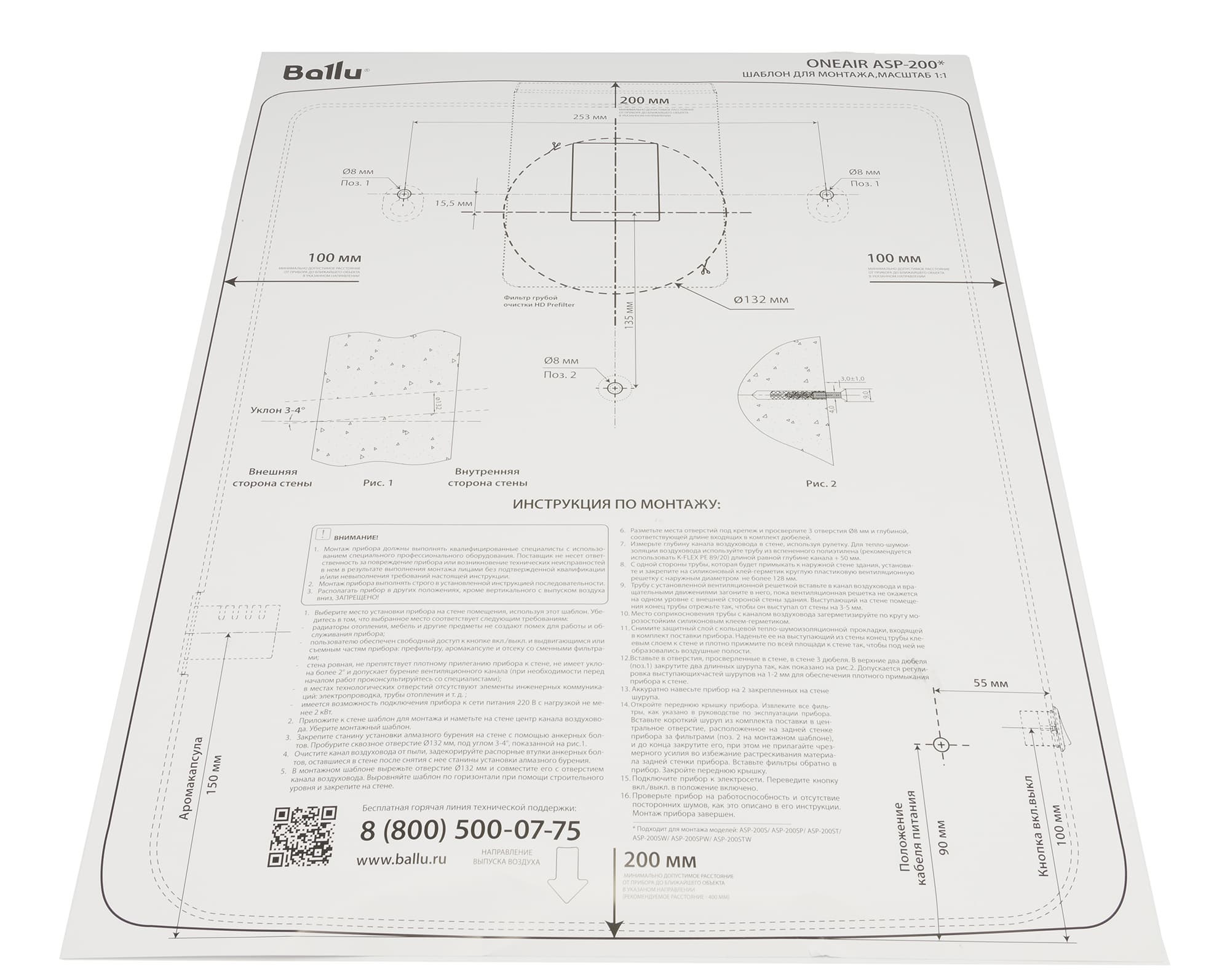 Перед установкой следует определиться с выбором места монтажа. Ballu OneAir ASP-200 может быть смонтирован только вертикально (с выпуском воздуха вниз). Располагать прибор горизонтально или, тем более, выпускной решеткой вверх, запрещается.