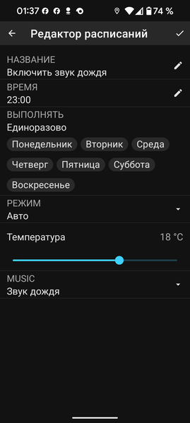 Редактор расписаний позволяет настроить включение нужных режимов и функций в зависимости от времени суток и дней недели. Можно настроить как повторяющиеся, так и однократные сценарии.