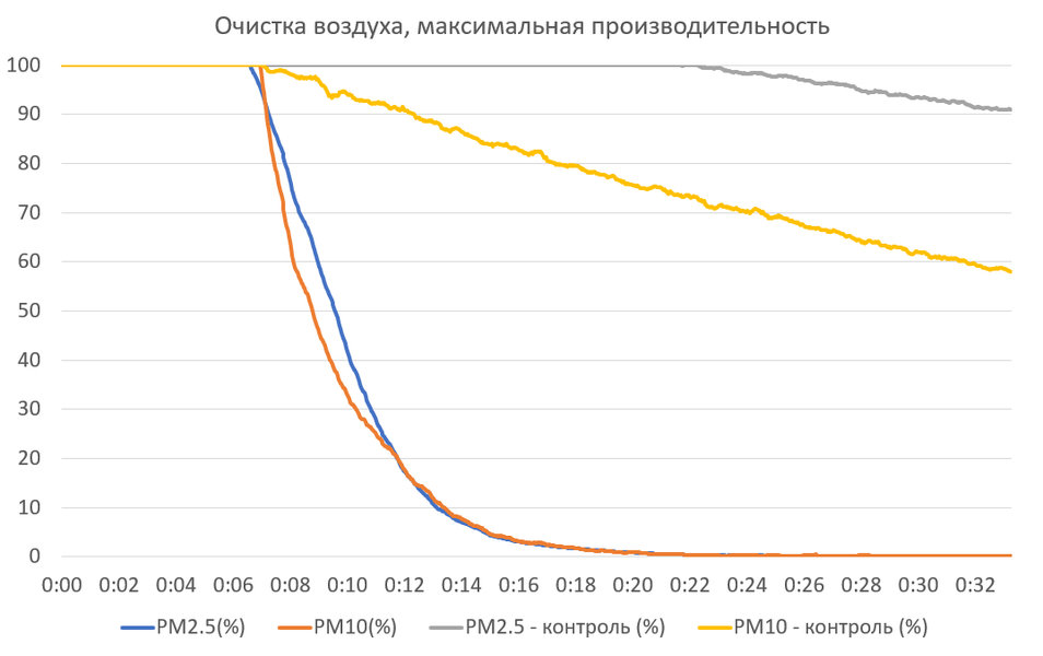 Запущенный в режиме наивысшей производительности Ballu OneAir ASP-200 снизил концентрацию взвешенных в воздухе микрочастиц на 50% от максимума всего за 10 минут. Через 20 минут работы устройства концентрация частиц PM2.5 достигла вполне безопасных 8,2 мкг/м³, а содержание частиц PM10 упало до 18,5 мкг/м³. Через полчаса с начала теста загрязненность воздуха снизилась до 1,4 и 2,3 мкг/м³ соответственно.