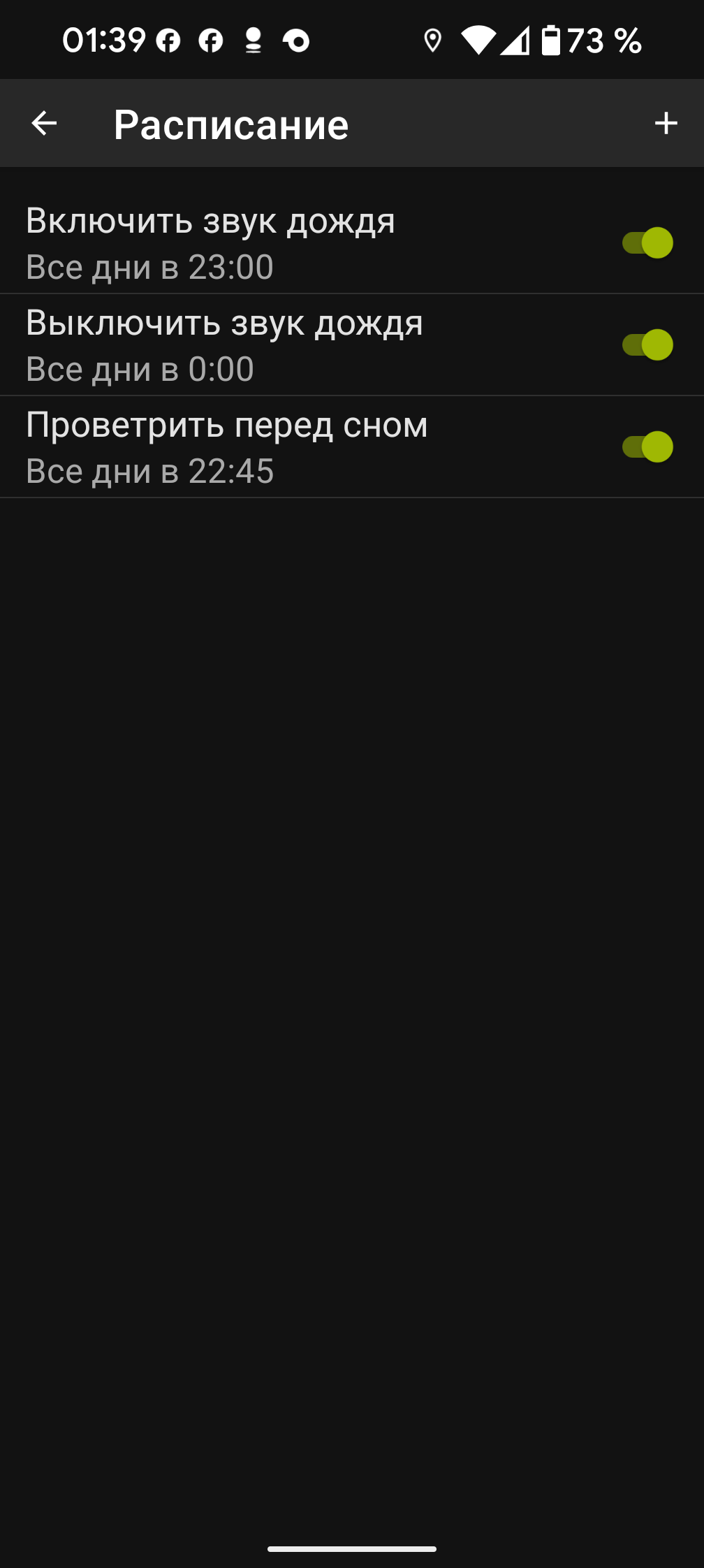 В приведенном примере мы настроили проветриватель так, чтобы каждый день перед сном он пятнадцать минут проветривал спальню в турбо-режиме, затем на час включал звуки природы, чтобы лучше засыпалось, а в полночь отключал саундтрек и переходил в ночной режим.