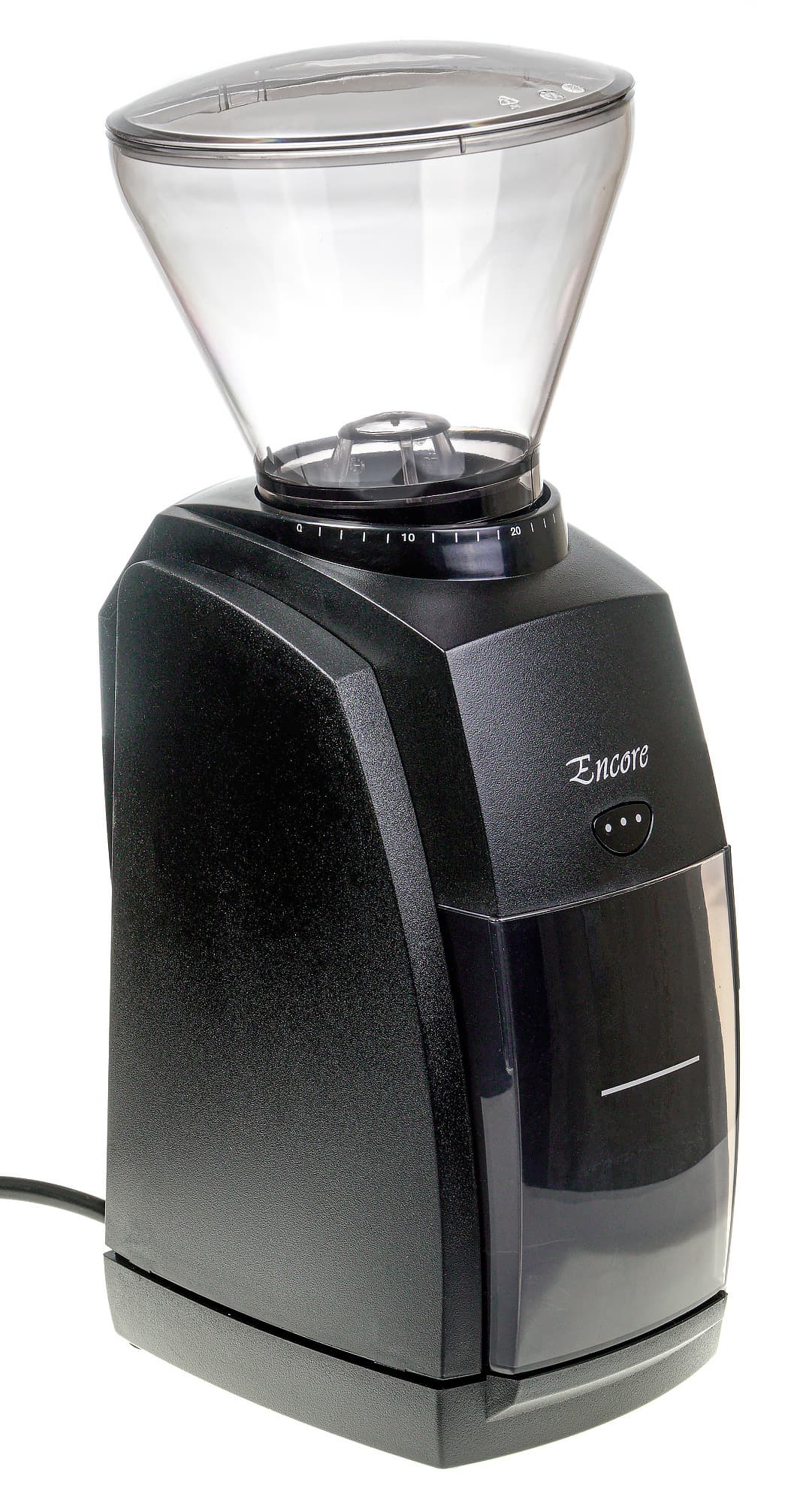 Спереди у кофемолки можно увидеть место для установки бункера для помола емкостью 5 унций (142 г) — он фиксируется с помощью небольшого пластикового «язычка», и кнопку для включения импульсного режима помола. Над кнопкой находится название модели — Encore. На бункере имеется горизонтальная черта, по всей видимости, призванная напомнить о том, что в какой-то момент нужно остановить помол и высыпать содержимое.