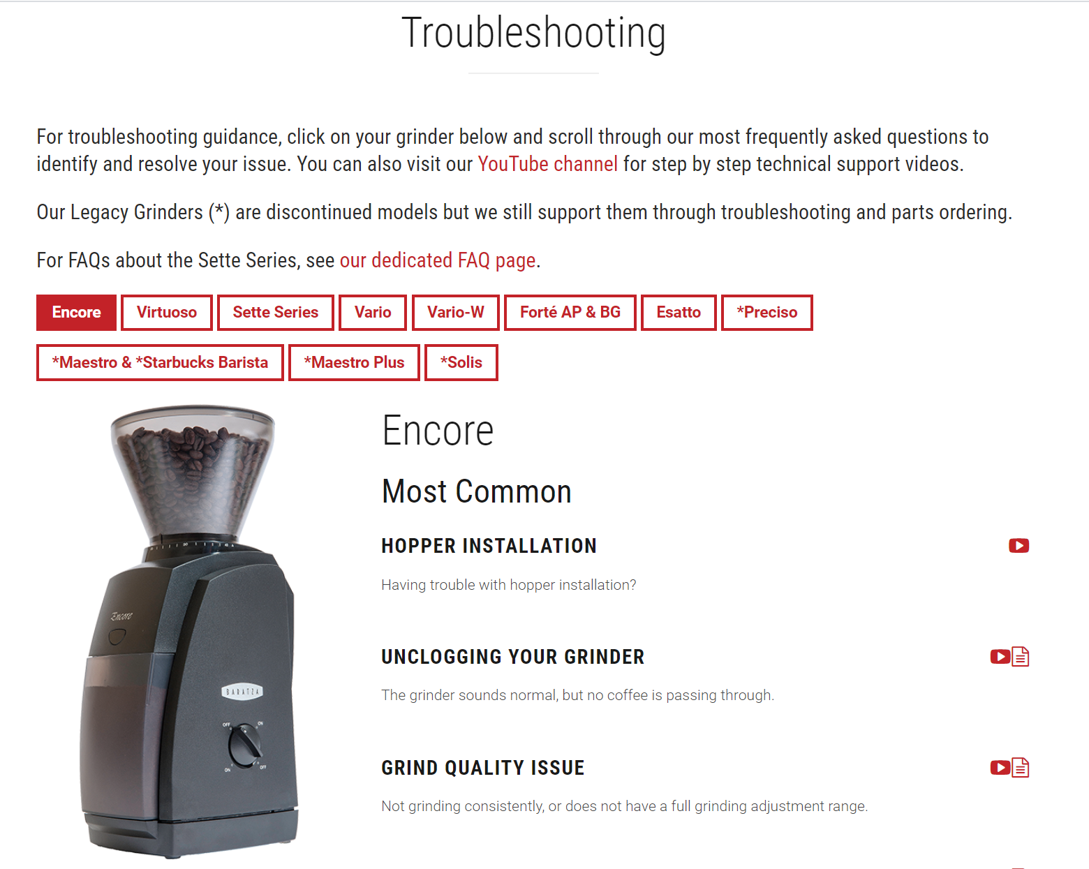 Помимо аксессуаров, на сайте также можно найти ответы на часто задаваемые вопросы, а также подробные инструкции, касающиеся обслуживания и ремонта кофемолок (в том числе в формате видеороликов). И в данном случае «ответы на вопросы» — это не формальность и не отписка в расчете на то, что никто не будет это читать. Производитель прямым текстом сообщает нам: «Don’t Dump Your Baratza – Fix It!» — «Не выбрасывайте свою кофемолку — отремонтируйте ее».