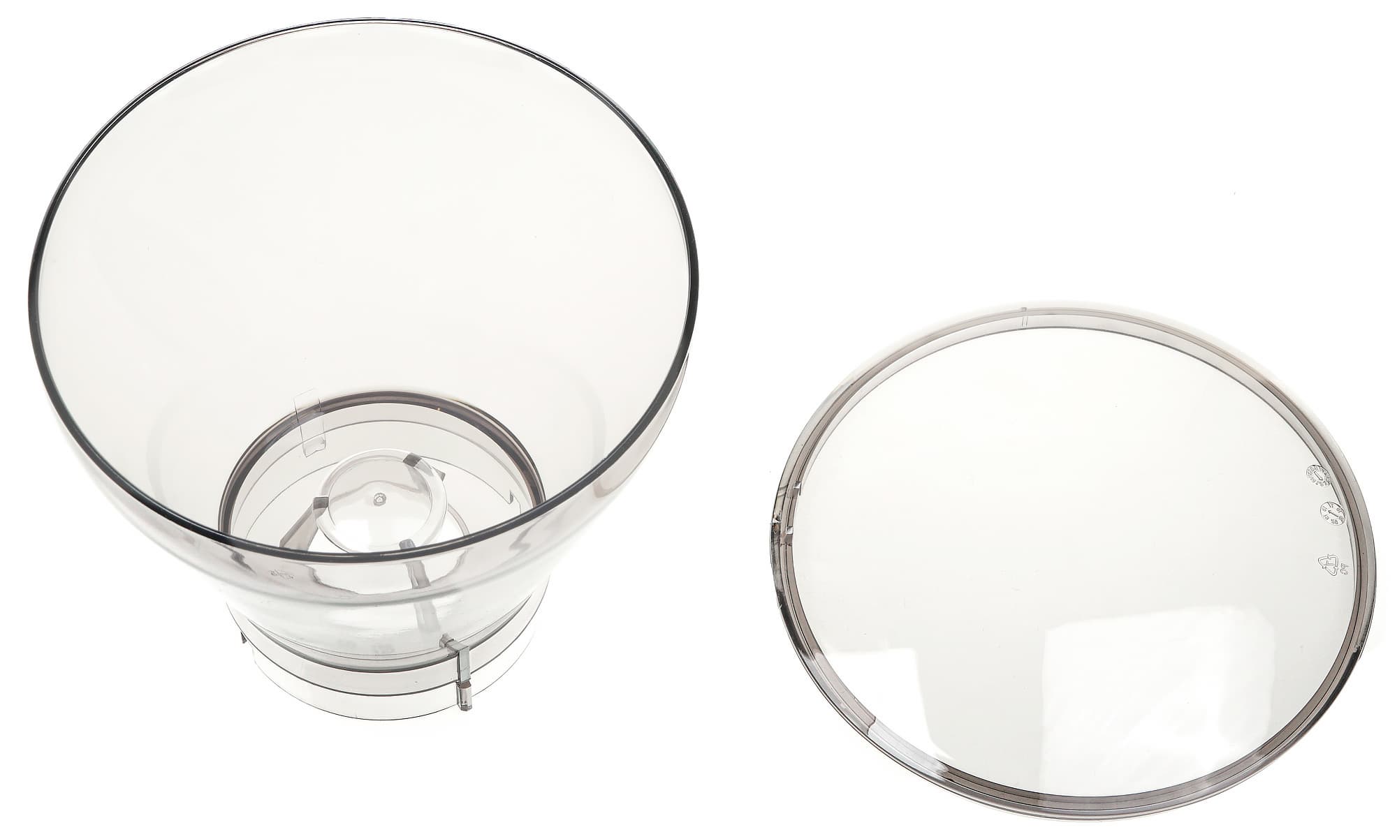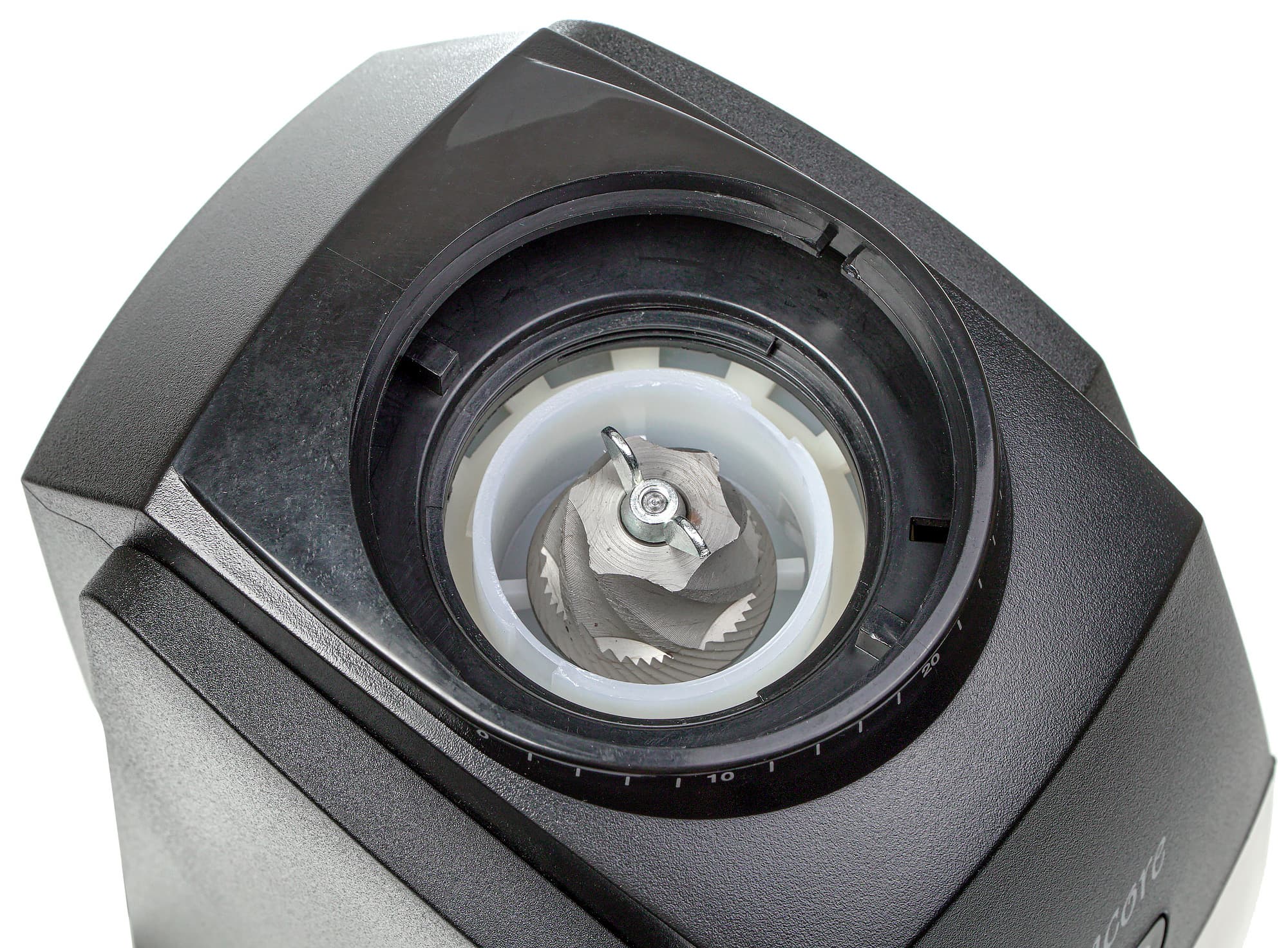 Сверху у кофемолки расположены жернова, поверх которых устанавливается контейнер для подачи зерен (хоппер) с пластиковой крышкой.