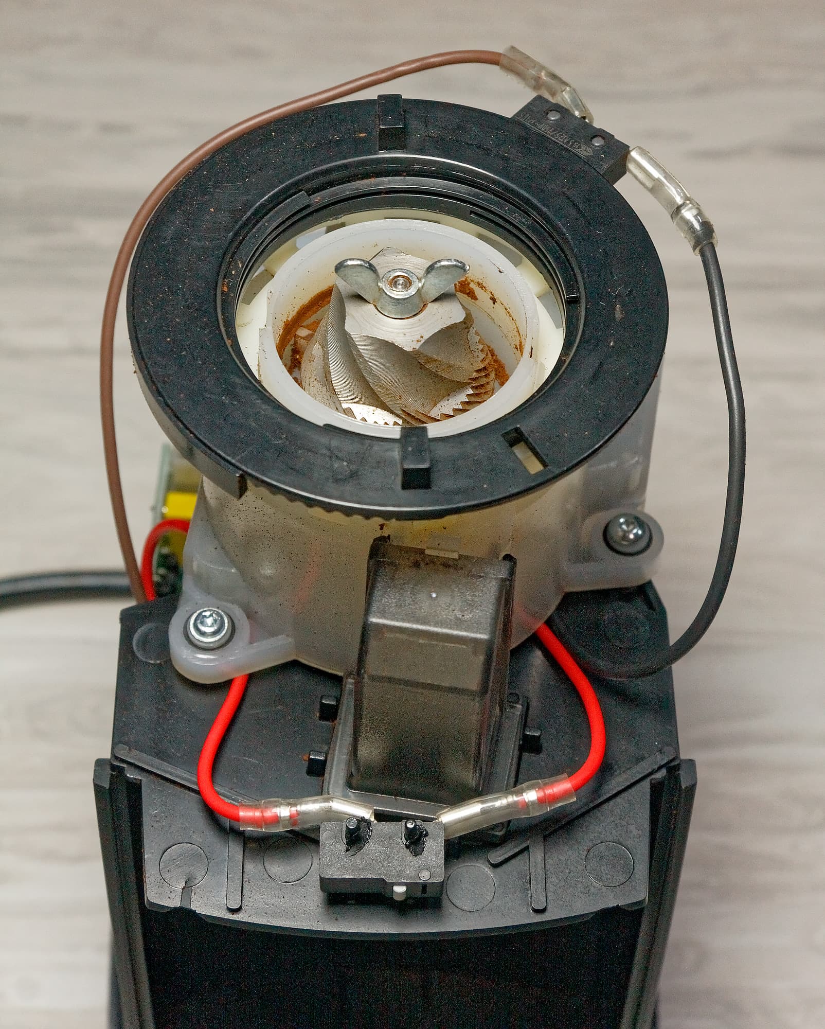 Зато благодаря этому происшествию нам удалось сделать несколько фотографий внутренностей прибора. Боялись мы, как оказалось, зря: механизм редуктора оказался спрятан внутрь своего собственного пластикового корпуса, а следовательно, затруднить его работу частицам кофе будет не так-то просто.