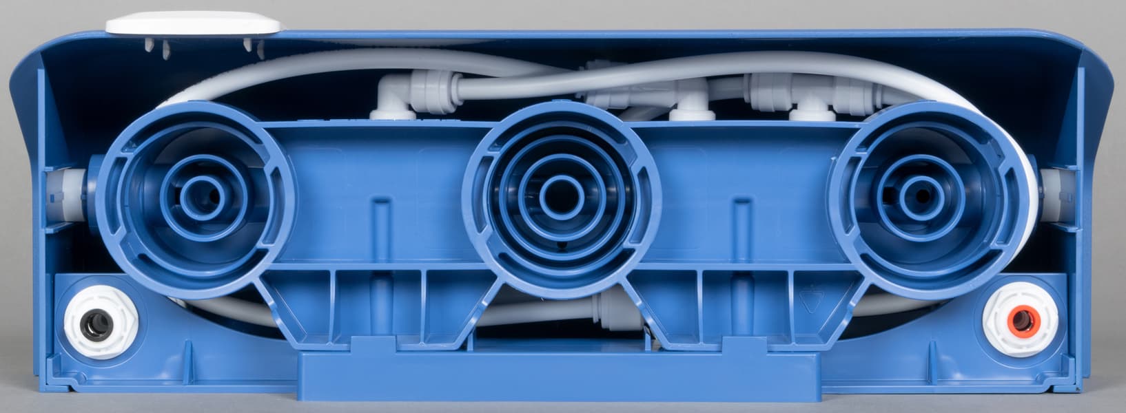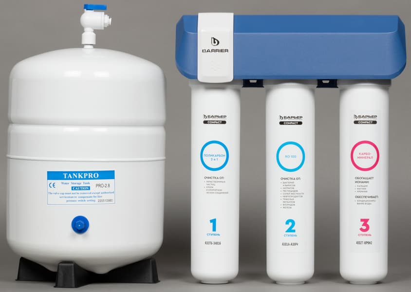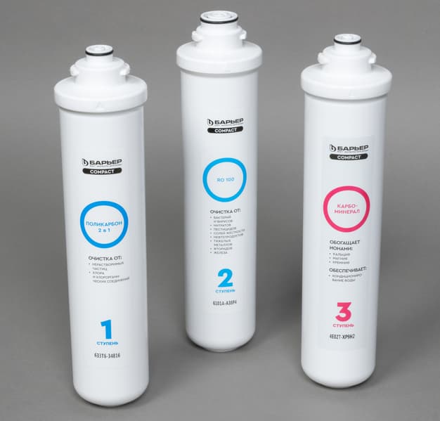 На третьем очищенная вода кондиционируется, насыщаясь полезными для здоровья ионами кальция, магния и кремния. Каждому этапу соответствует отдельный картридж: первый — поликарбоновый, второй — осмотический, третий — карбоминеральный.