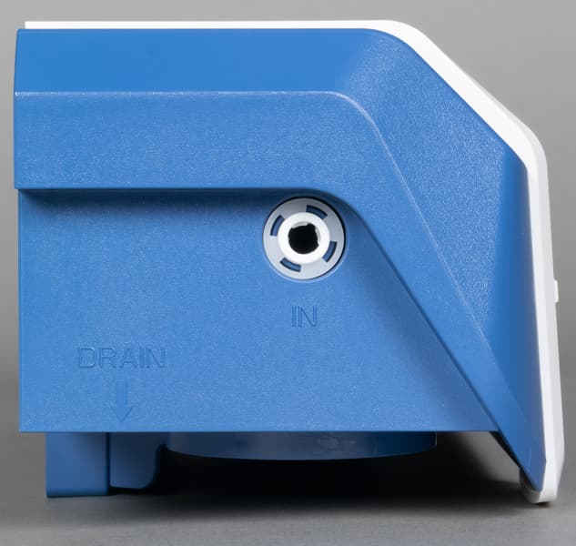 Отверстия с левой стороны предназначены для подключению к коммуникациям: коннектор на торце с пометкой «In» соединяет блок с магистралью холодного водоснабжения, а через отверстие снизу вода из мембранного фильтра отводится в канализацию.
