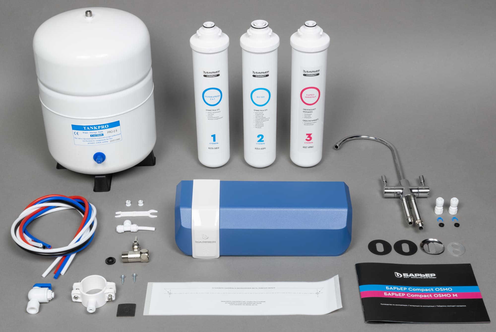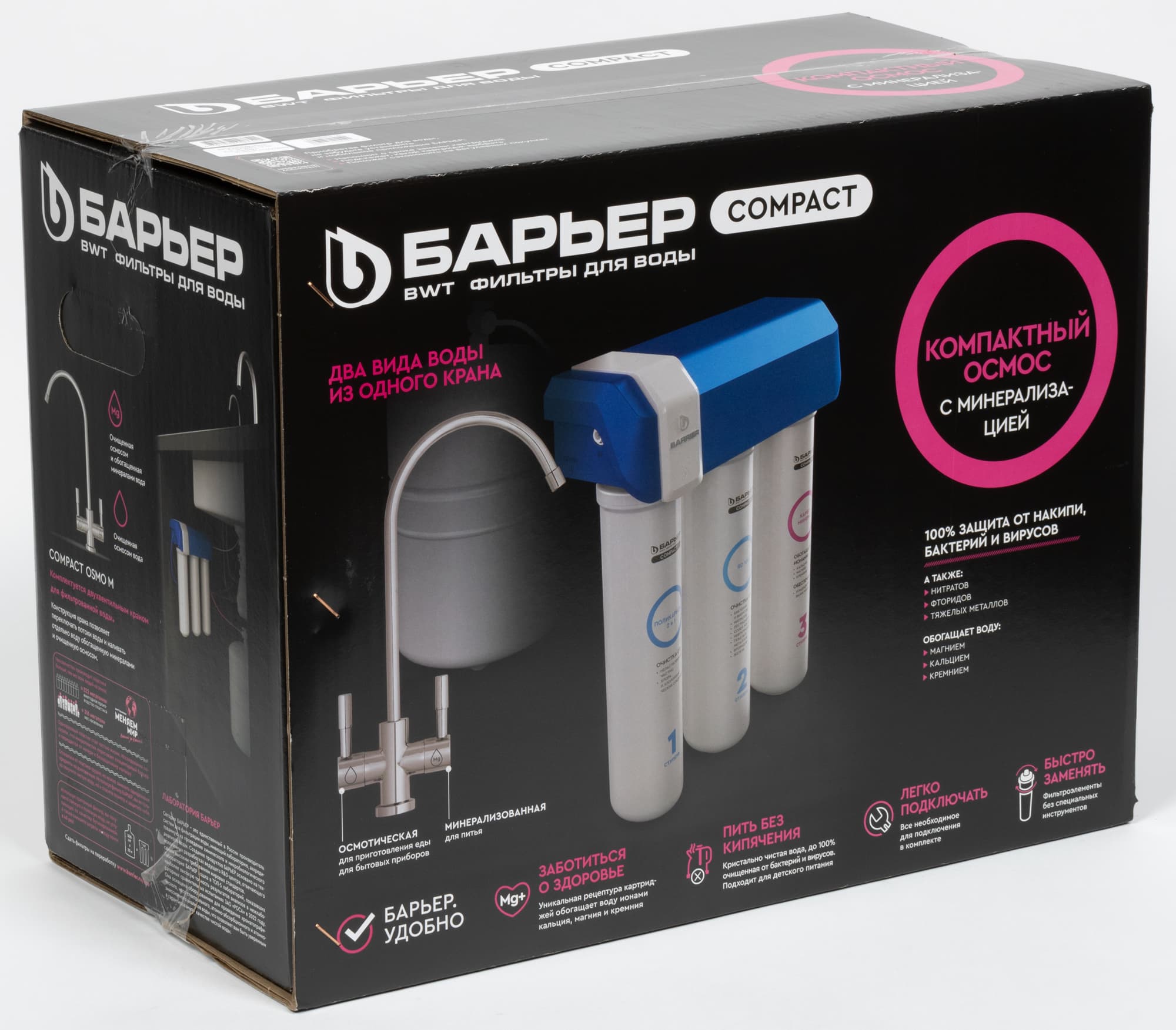 Например, поставим встроенный фильтр. Для первого обзора мы выбрали Барьер Compact Osmo M с обратным осмосом и минерализацией. Для этих двух видов воды у него всего один кран — это удобно. А насколько легко его ставить, эксплуатировать и обслуживать, вы узнаете из статьи.