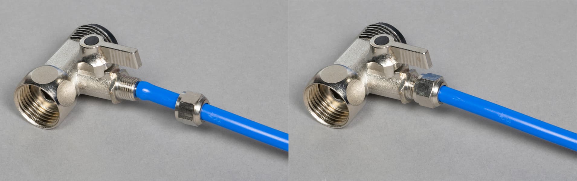 Для подключения к магистрали ХВС используется кран-тройник с наружной и внутренней резьбой на ¾″. К нему подключается трубка синего цвета.