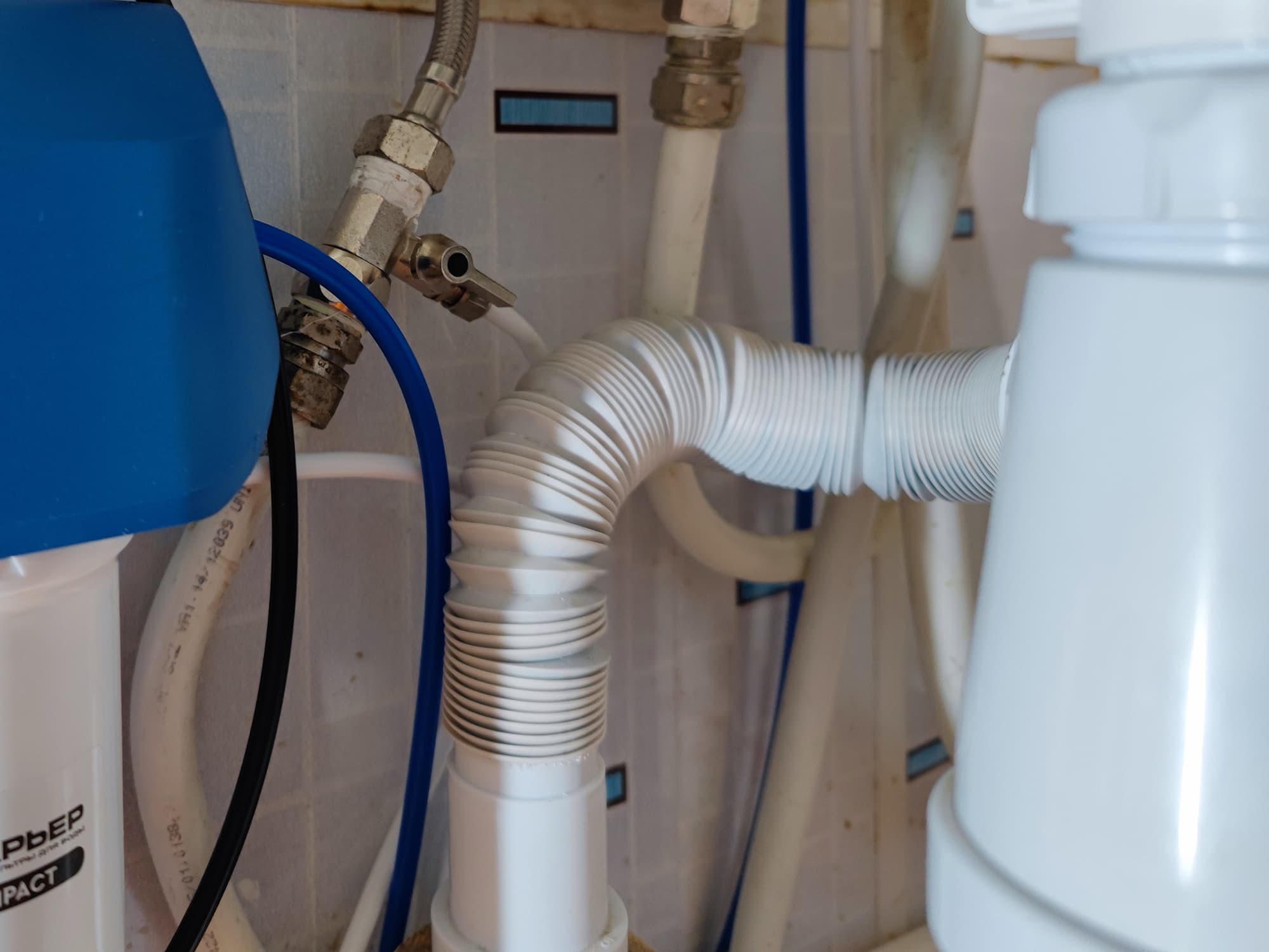 Другой конец трубки подводится к пластиковому тройнику, выходящему из нижней части корпуса. Белой трубкой тройник соединяется с фитингом крана, отмеченным «прозрачной» каплей.