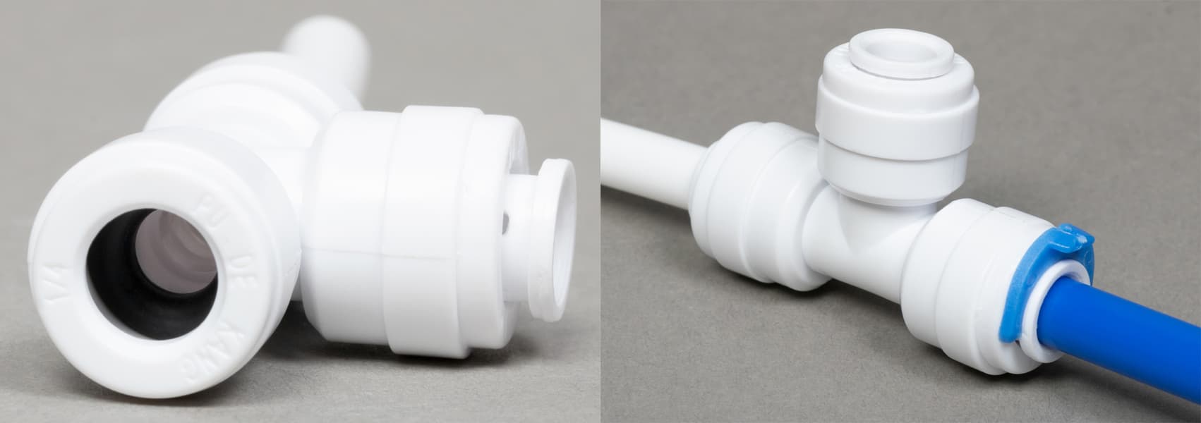 - пластиковый тройник для отвода очищенной обратным осмосом воды в накопитель и кран