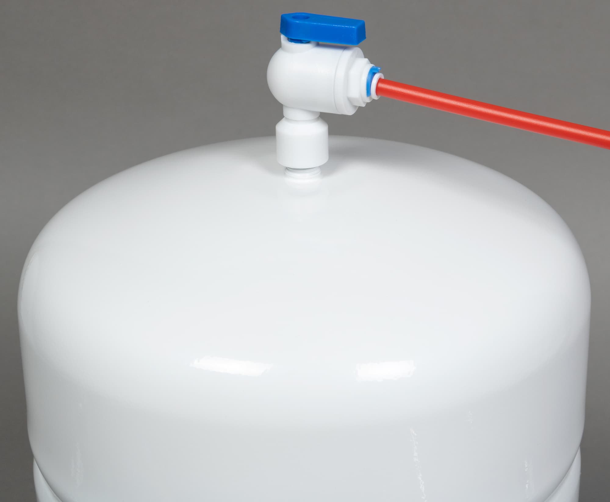 Вода, прошедшая предварительную фильтрацию и обратный осмос, через тройник раздается в кран и резервуар, устанавливаемый рядом с фильтром на горизонтальной поверхности.