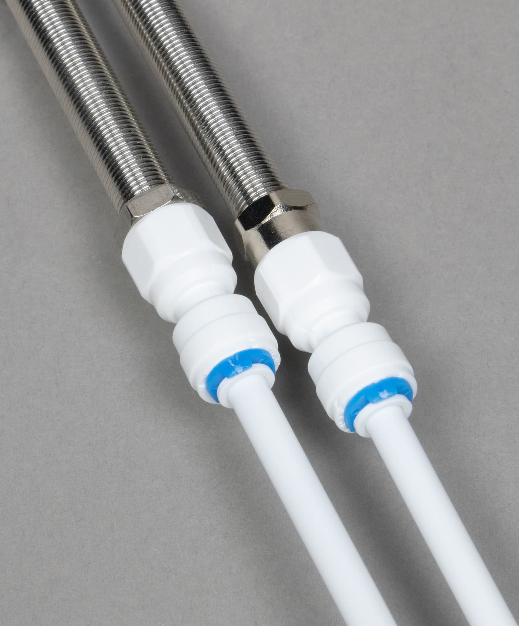 Соединительные трубки, которые мы обнаружили в комплекте, четырех разных цветов. Как уже упоминалось, для подключения к магистрали ХВС предназначена синяя трубка. Для отвода в канализацию — черная, осмотической воде соответствует красный цвет, а кран подключается белыми трубками.