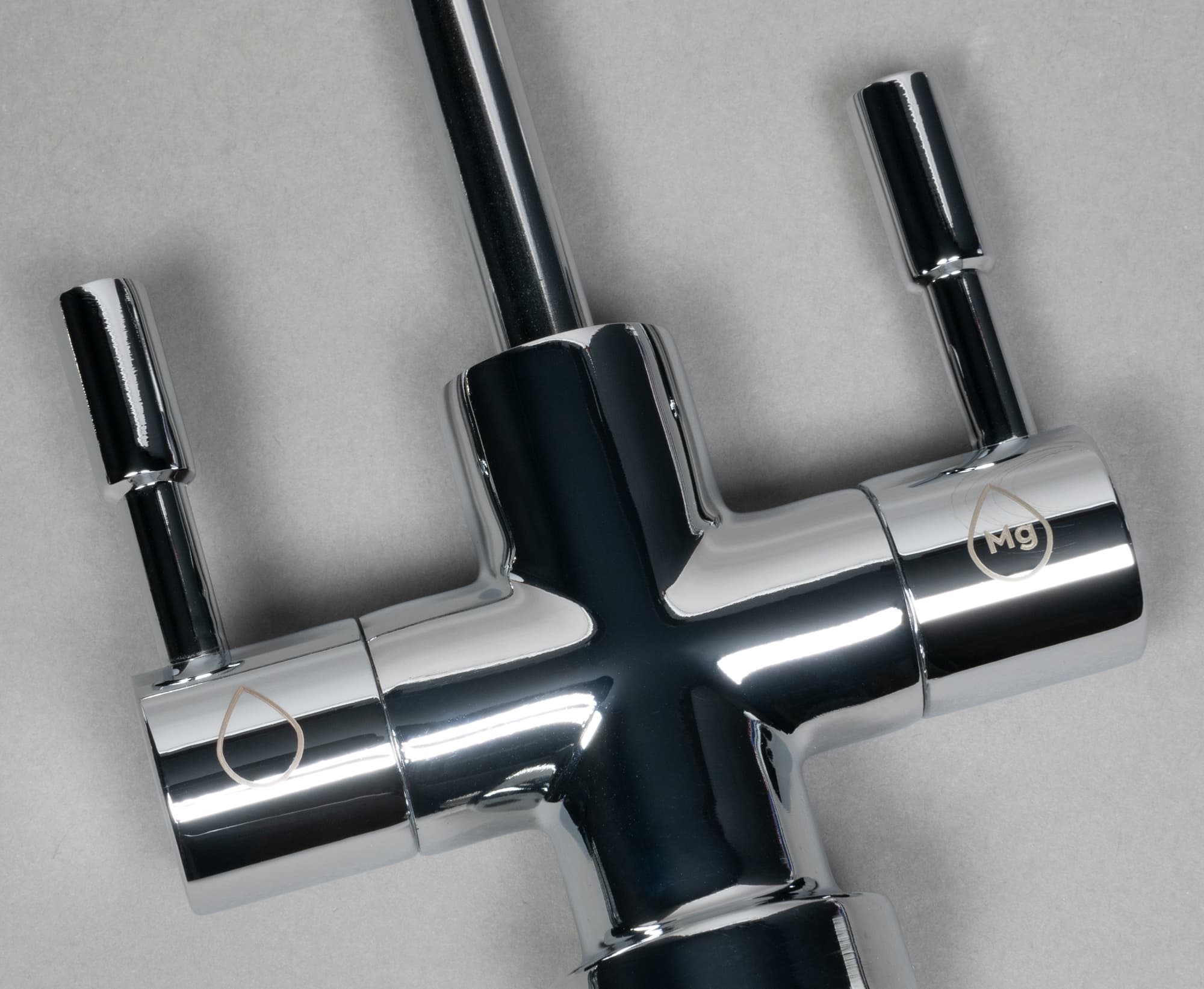 Наше устройство позволяет разливать воду в зависимости от ее назначения через один и тот же кран. Для этого у него два вентиля: прозрачная капля обозначает осмотическую воду, а капля с буквами «Mg» — минерализованную.