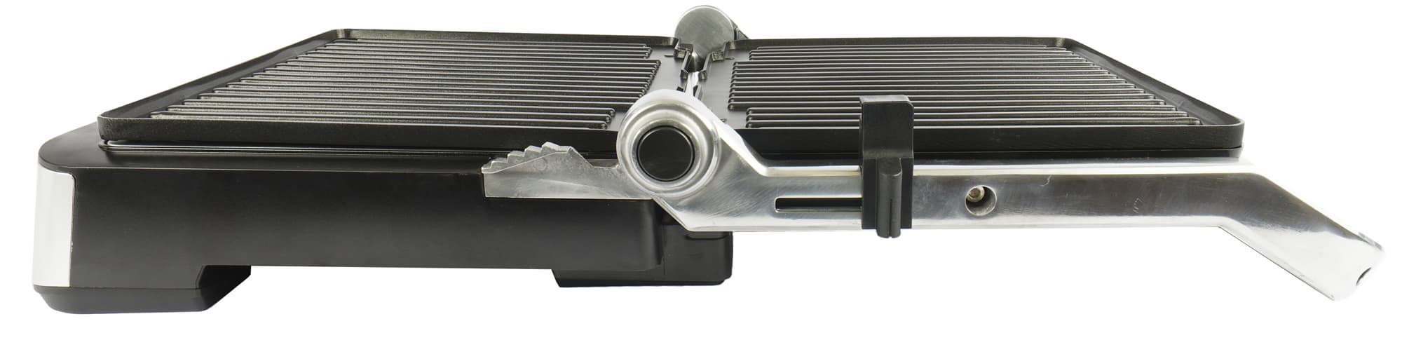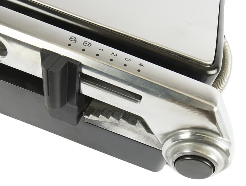 У него есть положение блокировки/разблокировки панелей (при необходимости он держит их закрытыми) и 4 положения, при которых крышка фиксируется горизонтально на необходимой высоте. Это полезно при жарке продуктов, которым противопоказано сильное сжатие. Тут же сбоку есть кнопка для раскрытия панелей на 180°. Ручка при этом становится опорой для крышки. Панели разложенного гриля горизонтальны, но чуть наклонены в центр — для стекания жира и сока по желобку в поддон.