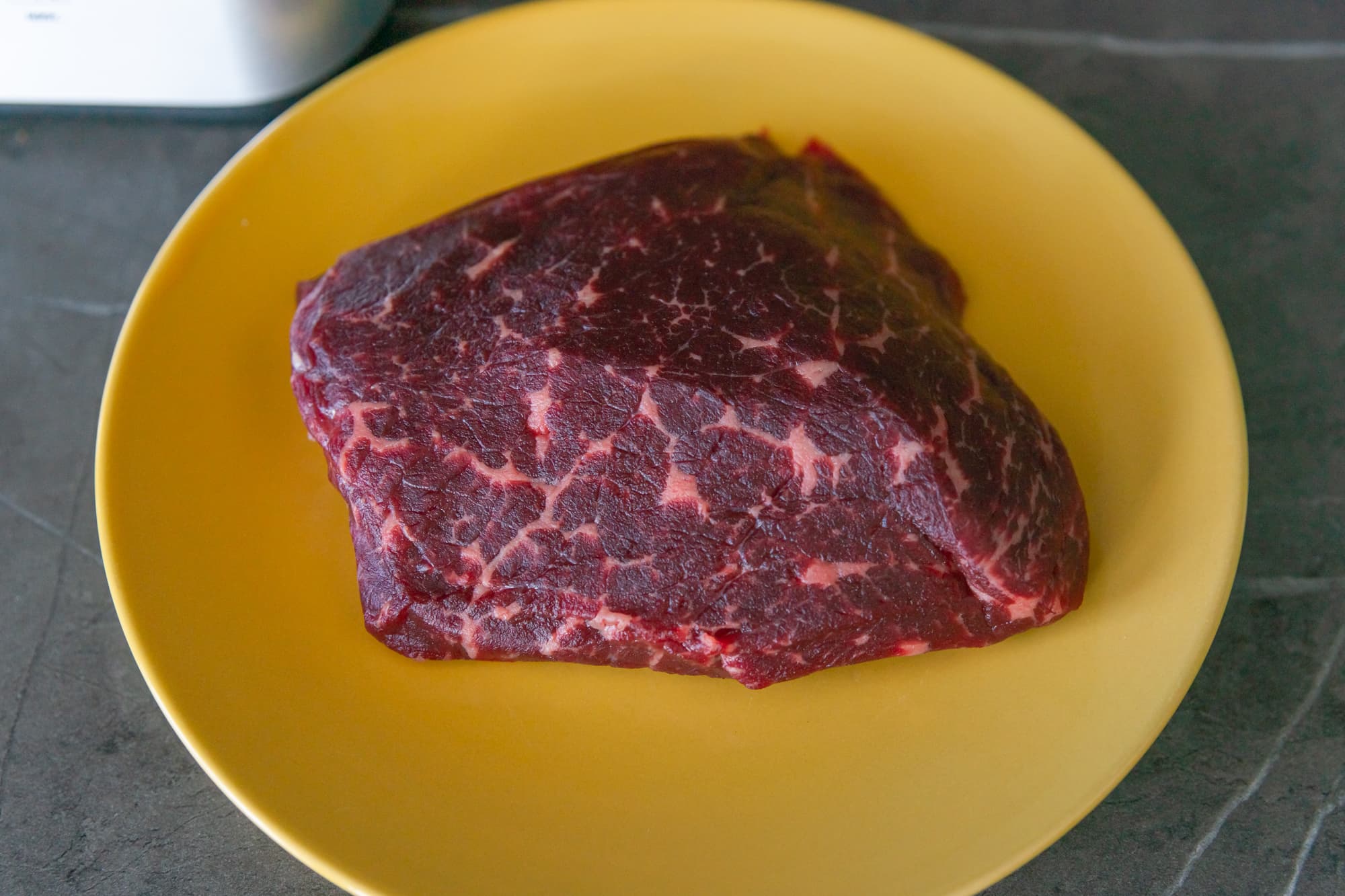 Когда температура внутри куска достигла 62 °C, отключили нагрев, сняли мясо на тарелку, поперчили, посолили, накрыли фольгой и на пару минут оставили в покое.
