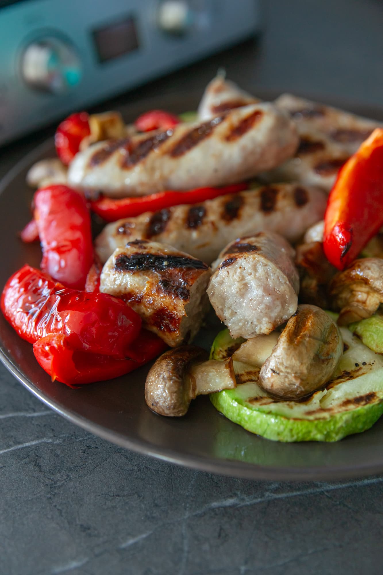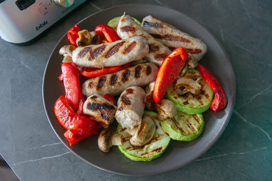 Колбаски получились сочные, с поджаристой корочкой, овощи — не сырые и не пересушенные.