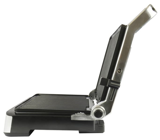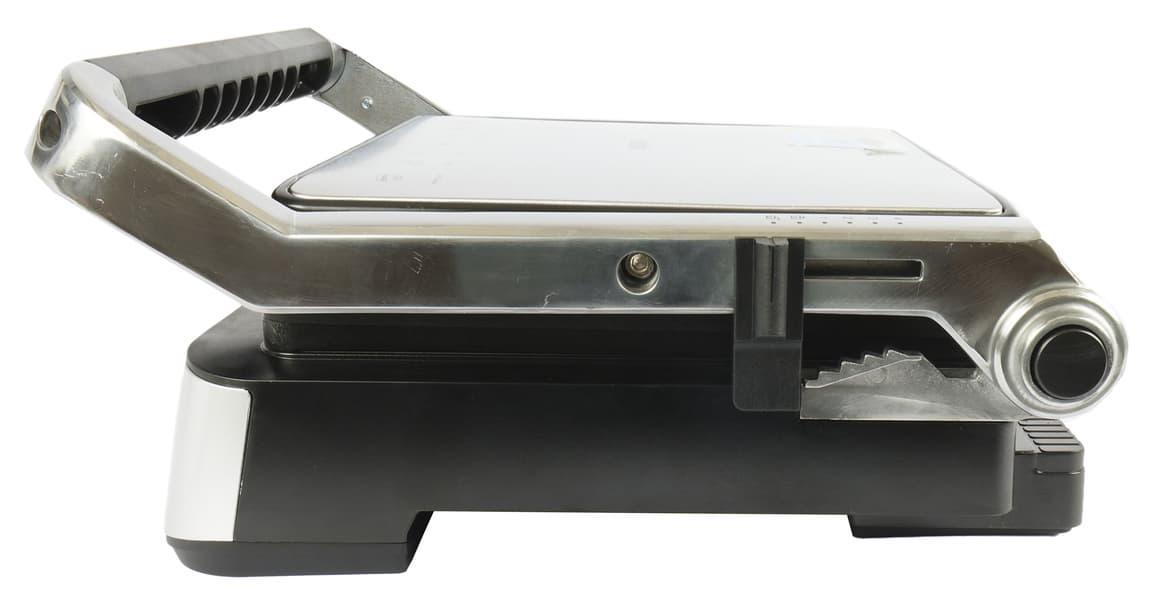 Крышка гриля открывается при помощи массивной загнутой вверх ручки. Зона захвата покрыта матовым пластиком с частичным рифлением.