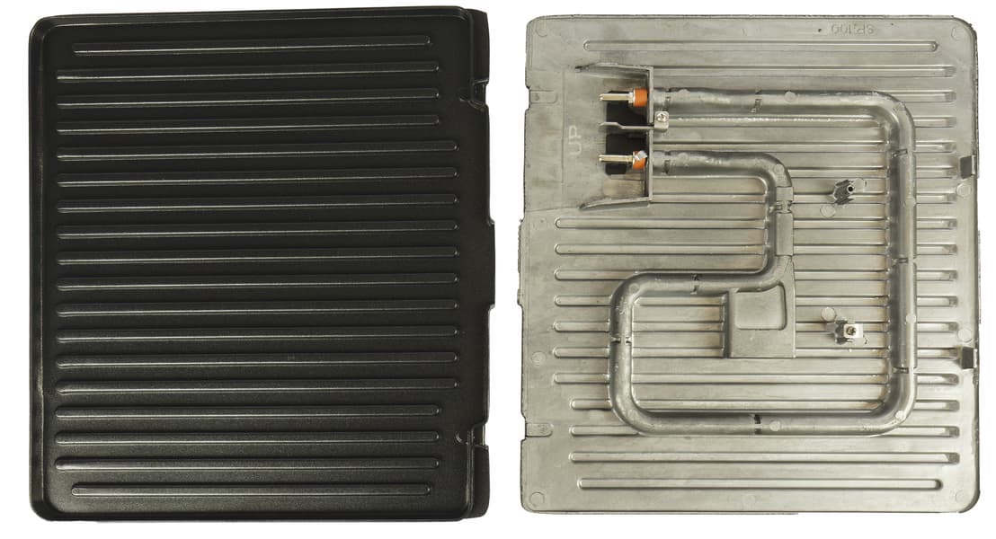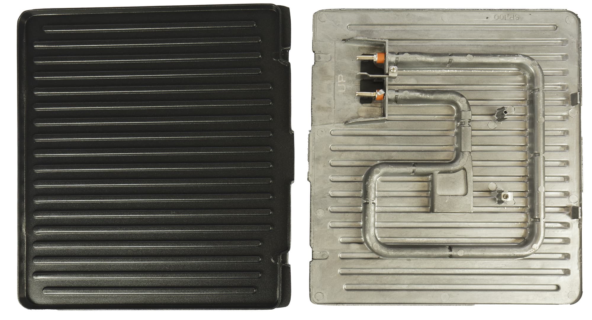 Рифленые панели со встроенным нагревательным элементом выполнены из металла с антипригарным покрытием. На ощупь поверхность гладкая, без царапин и сколов. Панели фиксируются и снимаются при нажатии на выступающие из корпуса черные кнопки с надписью Release. Размер панели — 28,5×26 см.