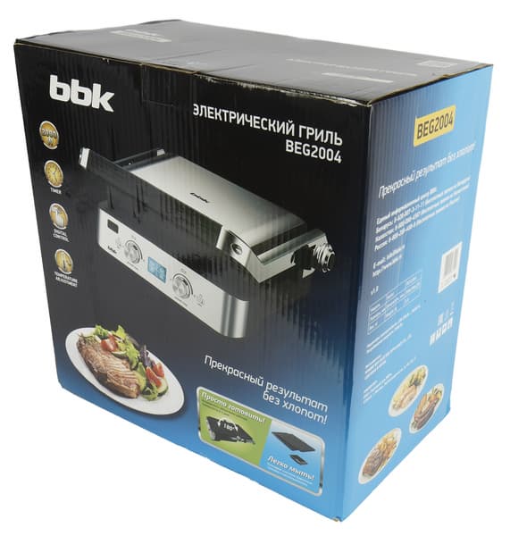 Гриль BBK BEG2004 прибыл к нам в фирменной коробке из прочного картона с качественной полноцветной полиграфией. На гранях упаковки размещены изображения самого прибора, а также описание его ключевых особенностей и технические характеристики. Ручки для переноски на коробке не предусмотрено.