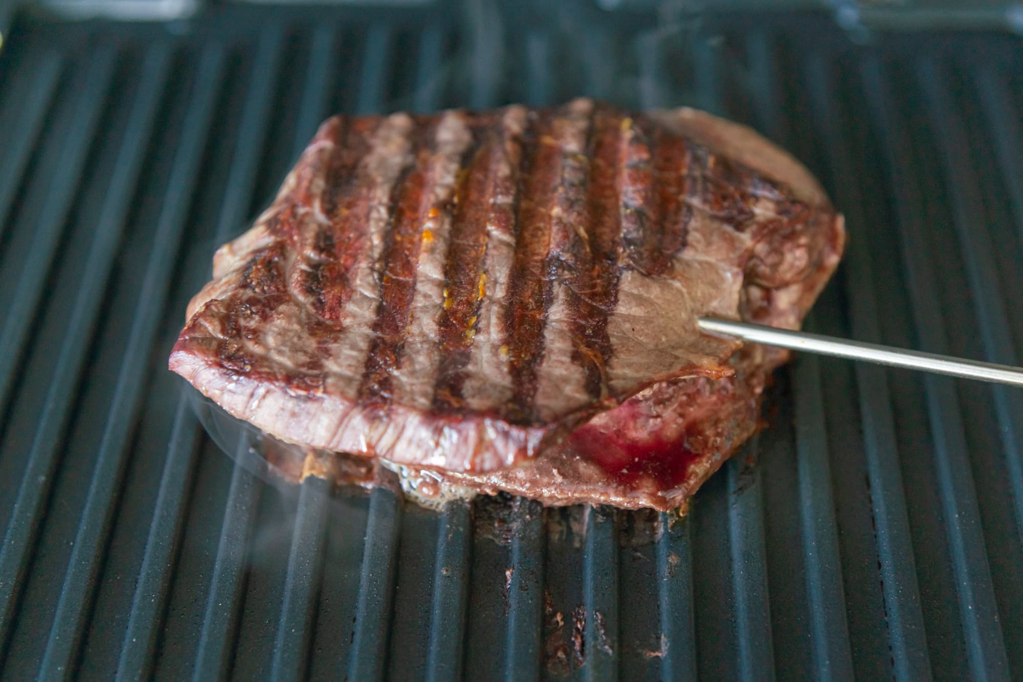 Для первого теста мы разогрели гриль до 220 °C и после звукового сигнала выложили на нижнюю панель кусок говядины. Прижали крышкой и стали ждать сигнала уже от термощупа.