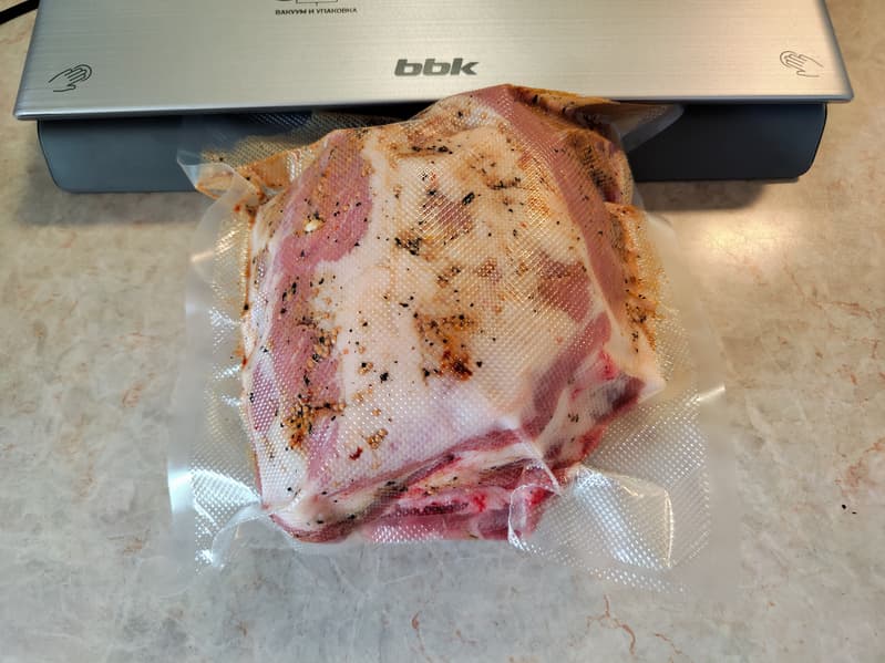 Вообще вакуумирование и упаковка более чем несложны и занимают совсем немного времени, но результаты работы упаковщика нас по-настоящему порадовали. Особенно восхитила возможность запаивать влажные пакеты, не следить за чистотой внутренних стенок, что очень важно, когда упаковываешь продукты с маринадом. Вакууматор BBK BVS803 за всё время эксплуатации проявил себя как очень комфортный, предсказуемый и некапризный прибор.