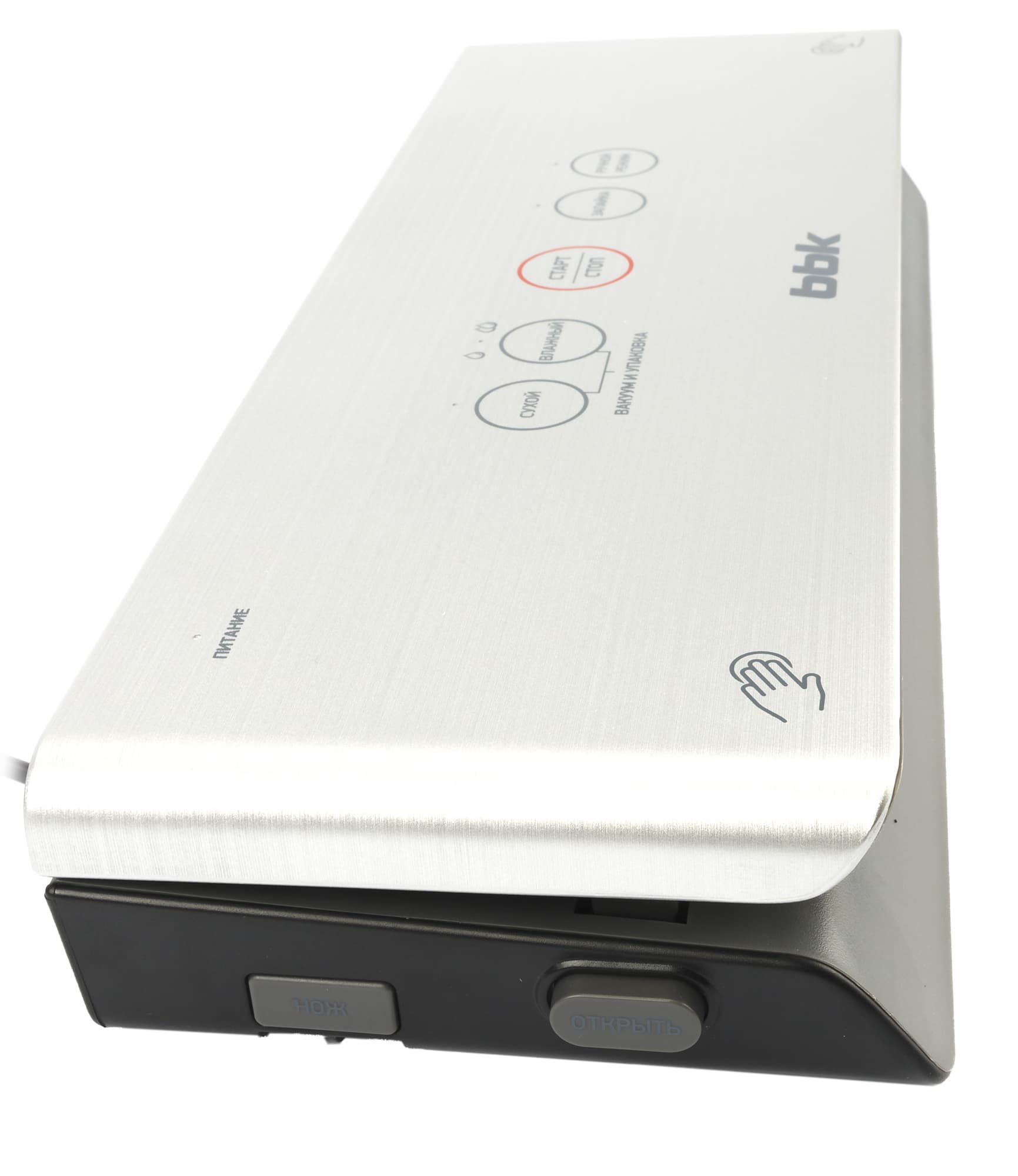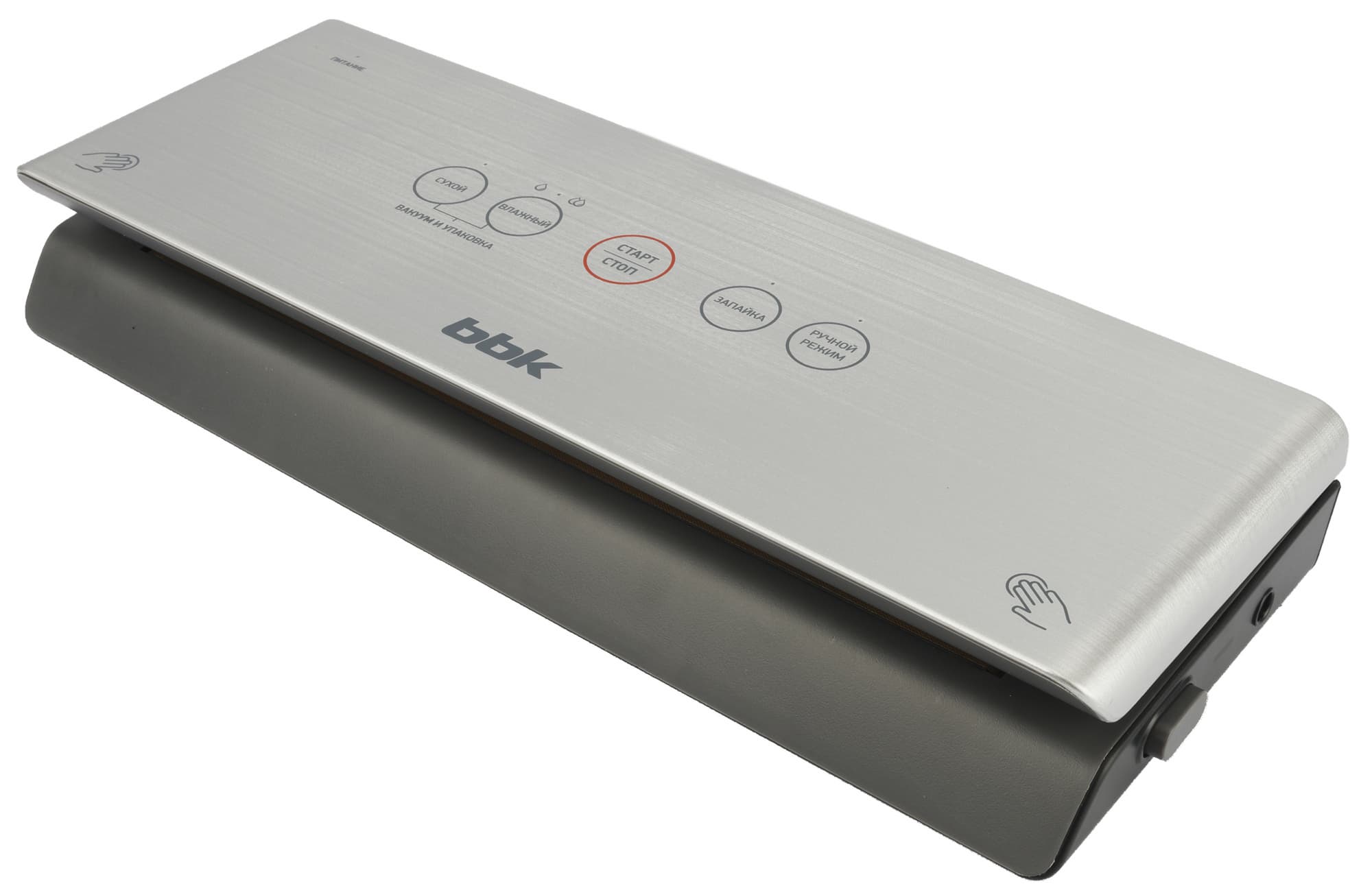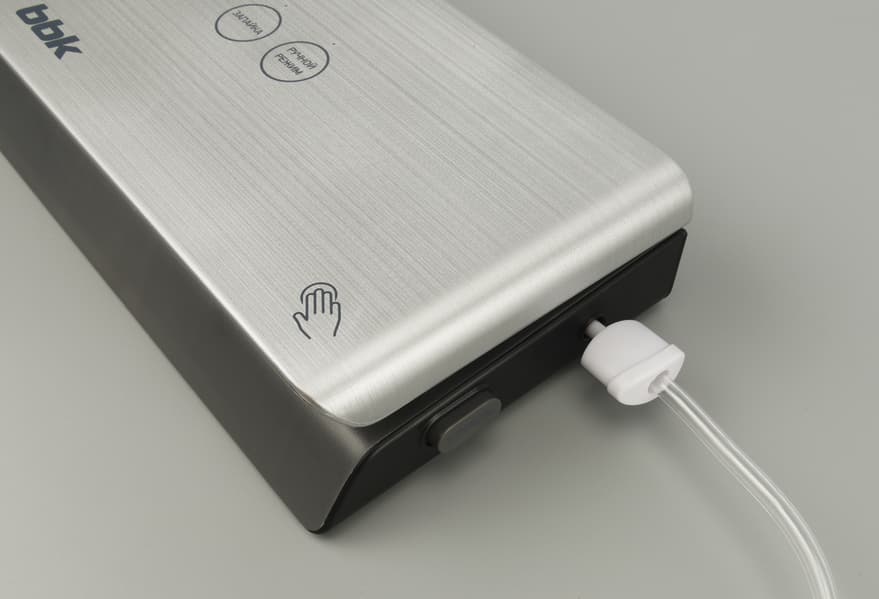 Вакуумный упаковщик BBK BVS803 изготовлен из пластика черного, темно-серого и серебристого «под металл» цвета. Верхняя панель похожа на металлическую, то, что она пластиковая, замечаешь только после пристального вглядывания.