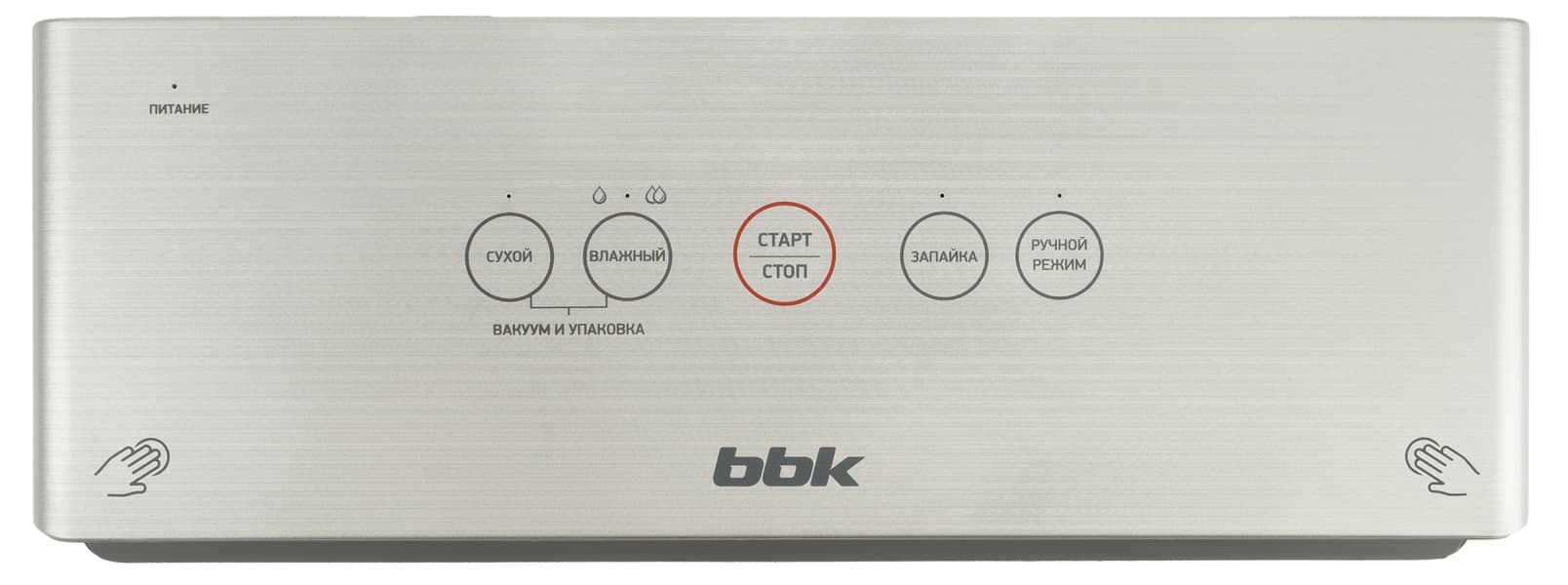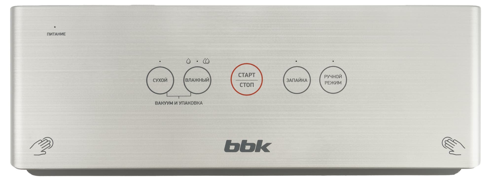 Элементы управления расположены в привычном и наиболее удобном месте — на крышке вакууматора. Сенсорные кнопки снабжены индикаторами и надписями на русском языке.