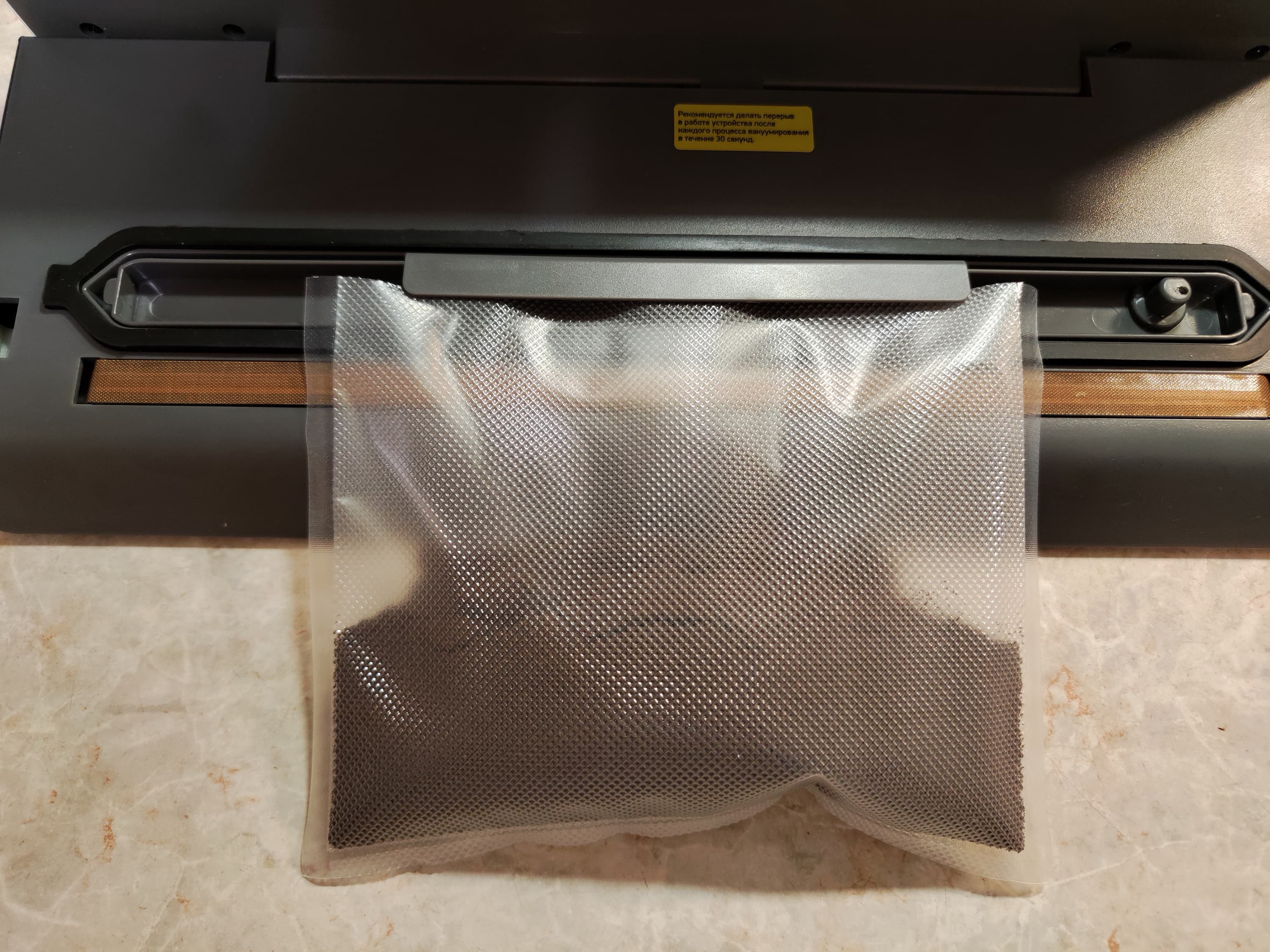 Ну, и совсем последний тест с кофе — не пропадать же оставшемуся маленькому пакету: уложим в него максимум возможного объема кофе так, чтобы можно было еле-еле закрыть крышку. Мы с большим трудом разместили края пакета под ограничителями (они в таких случаях незаменимы), аккуратно закрыли крышку вакууматора буквально в нескольких миллиметрах от края продукта и запустили процесс упаковки.