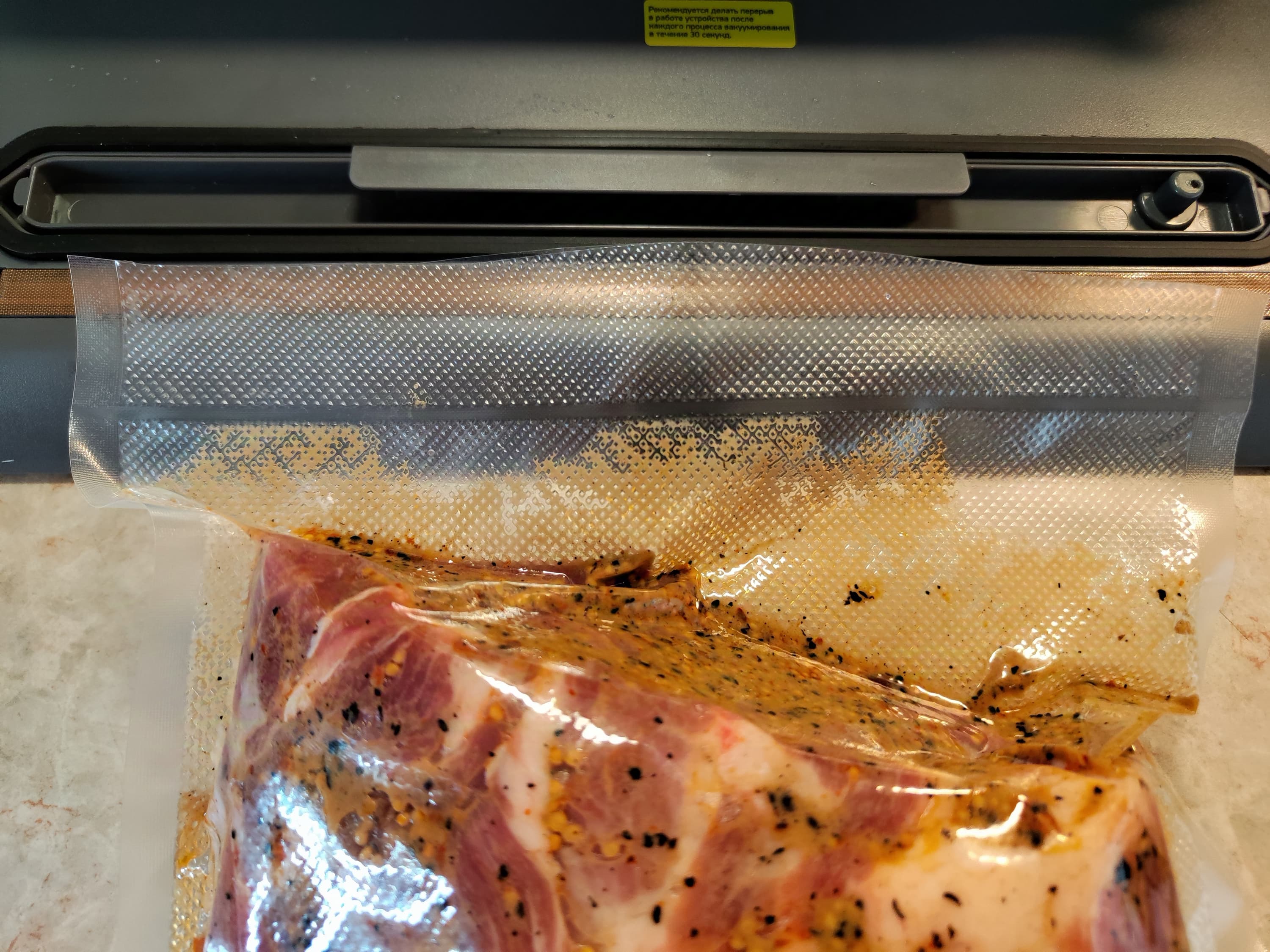 Не получилось, поэтому воспользовались заготовленным заранее рулоном, отрезав нужную длину и запаяв в соответствующем режиме край отреза. Затем установили режим продукта умеренно влажный, нажав на кнопку «Влажный» один раз. Вакууматор начал жужжать и шуметь, быстро отсасывая воздух и обжимая пакет вокруг куска мяса. Весь воздух был успешно удален, пакет плотно облегал продукт.