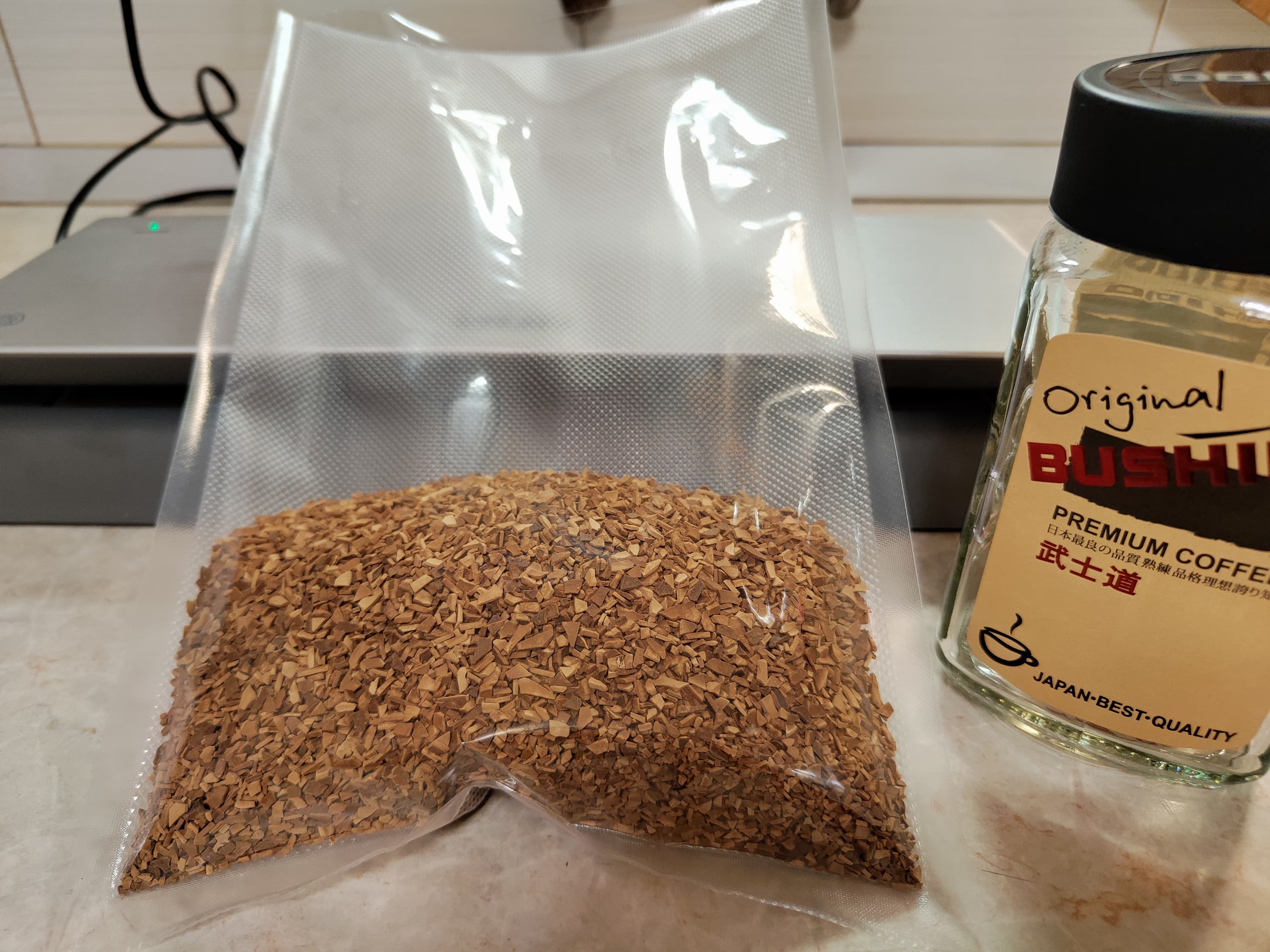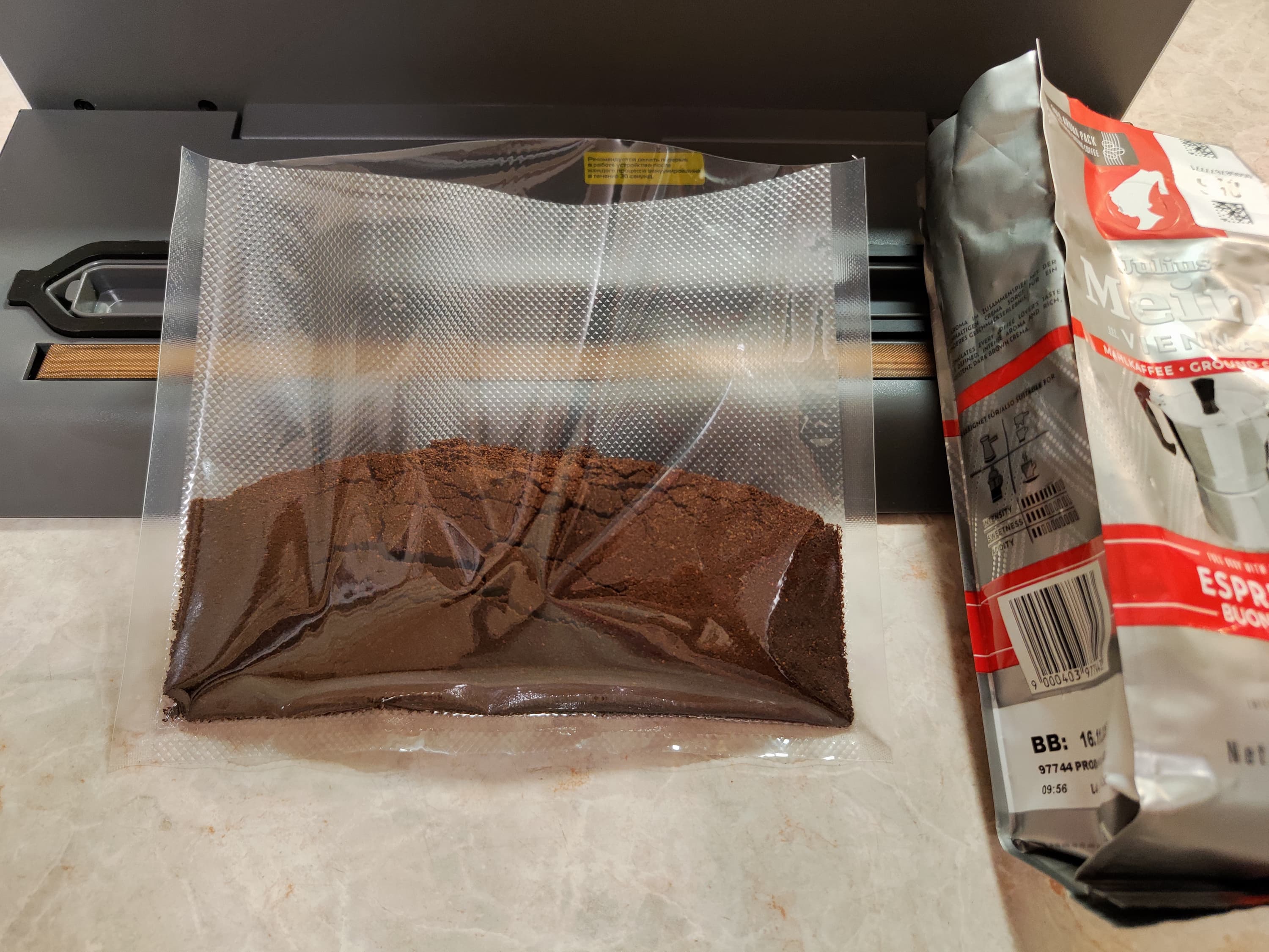 Выше можно видеть результат: продукт завакуумирован, воздух удален, кофе внутрь запайки шва не попал. Ну каков прибор, а!