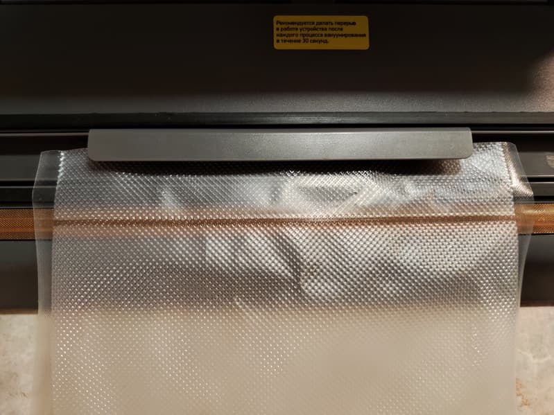 Мы извлекли пакет, очистили съемную емкость вакуумной камеры, слегка протерли бумажной салфеткой края пакета и повторили эксперимент. В этот раз мы принудительно остановили вакуумирование и воспользовались функцией запайки. И еще раз на всякий случай чуть выше, чтобы уж наверняка. Оба шва получились ровные, без заломов и непропаянных участков. При этом воздуха внутри пакета почти нет, продукт обжат достаточно плотно.