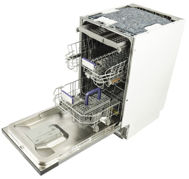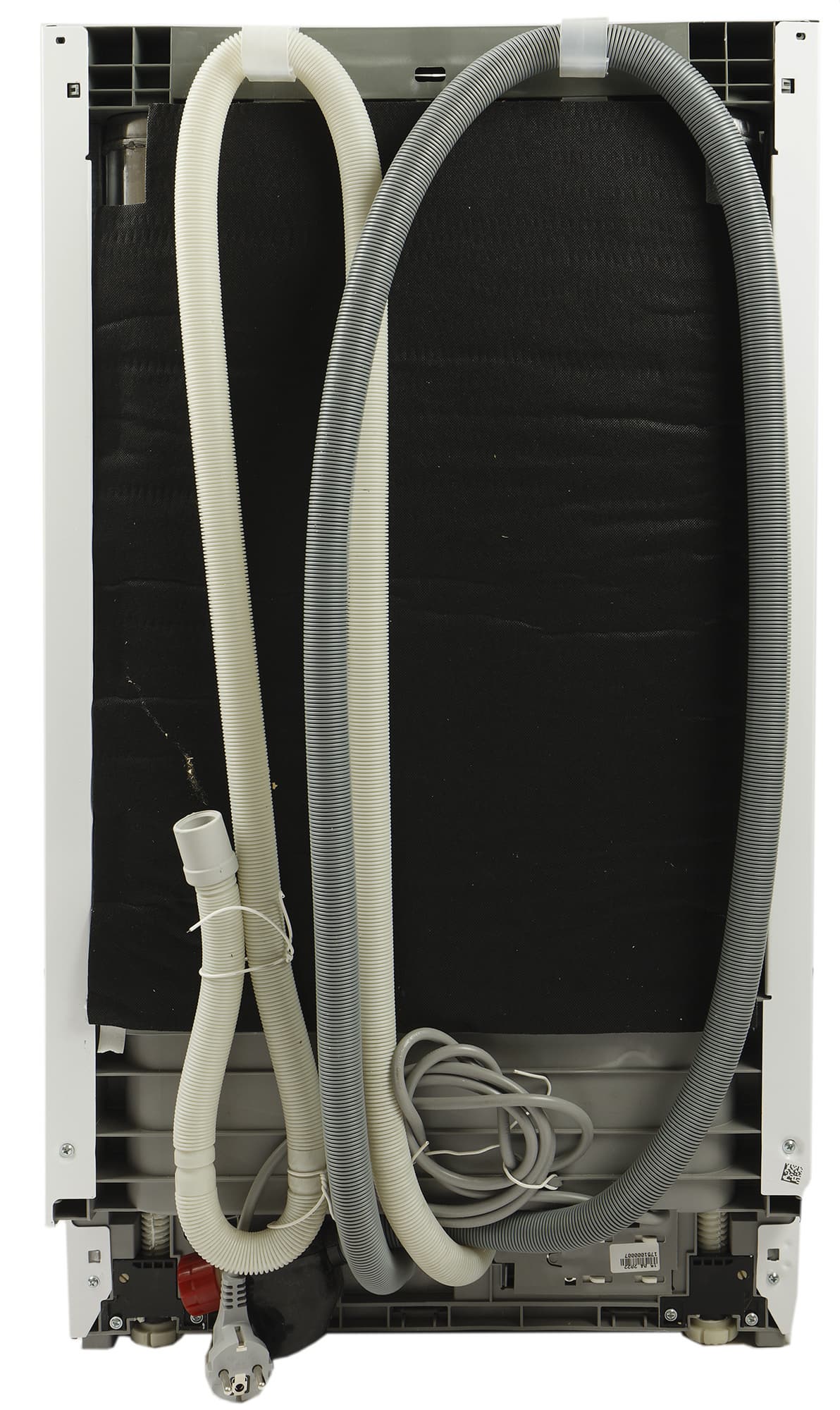 Вскрыв коробку, мы обнаружили внутри саму посудомойку с установленными полками, пакет документации, тестовую бумажную полоску для самостоятельного определения жесткости воды и воронку для соли.