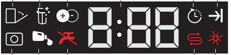 Выставленные пользователем опции отображаются на дисплее белым цветом, а если возникает нештатная ситуация (отсутствие воды в водопроводе, соли в смягчителе или ополаскивателя в резервуаре), загораются красные предупреждающие сигналы.
