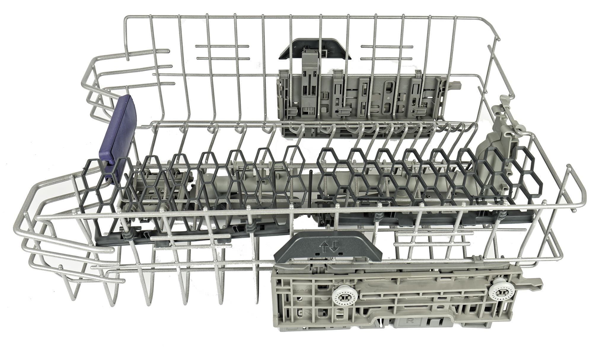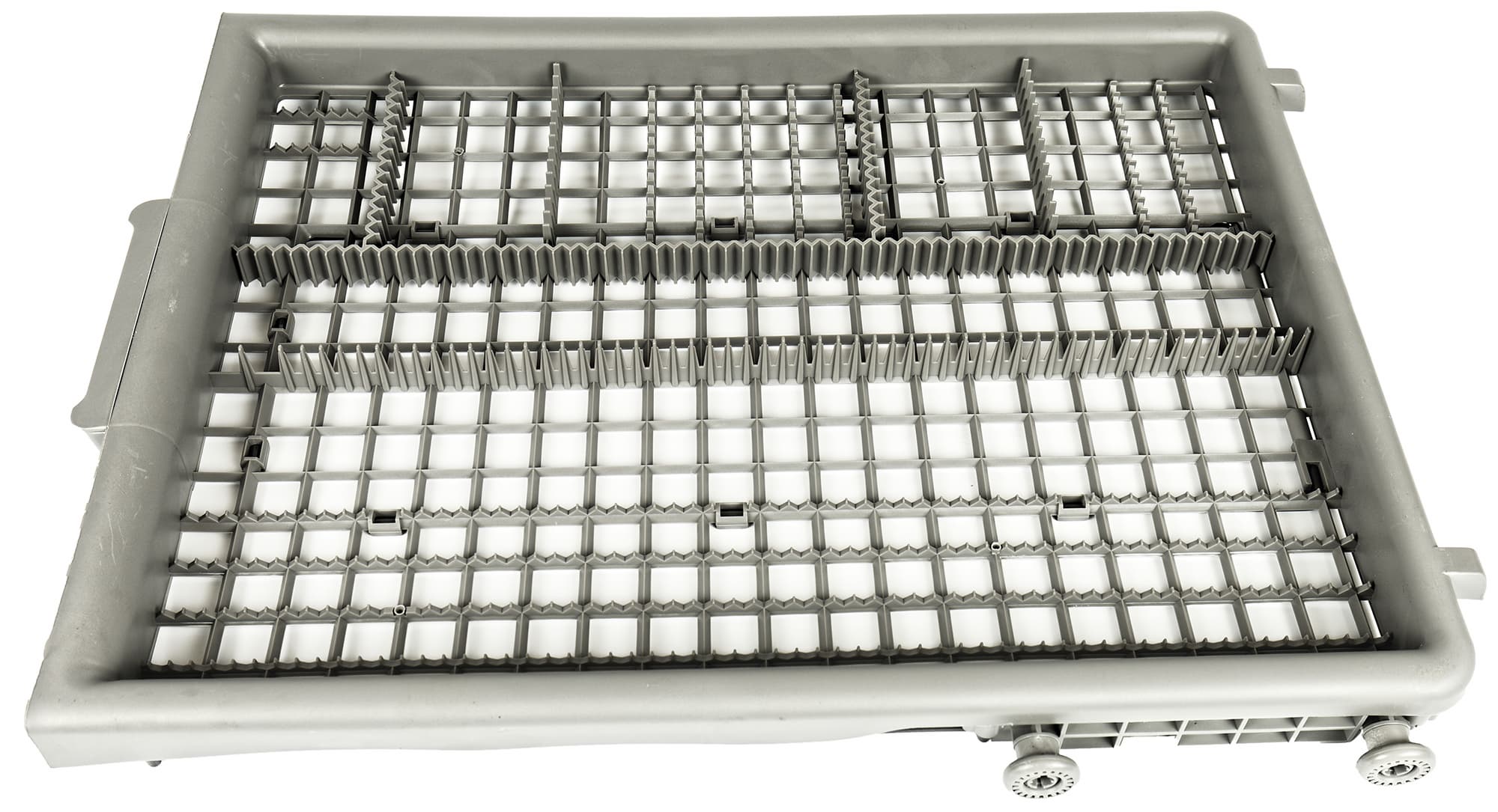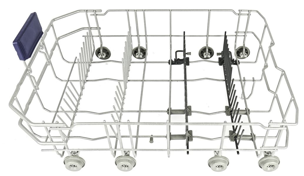 Нижняя корзина опирается на восемь роликов и допускает размещение предметов в два ряда. У ближнего расположение направляющих фиксированное, а те, что в дальнем, могут складываться — на них можно разместить еще десяток тарелок или при сложенных поставить на дно корзины одну или две крупные кастрюли.