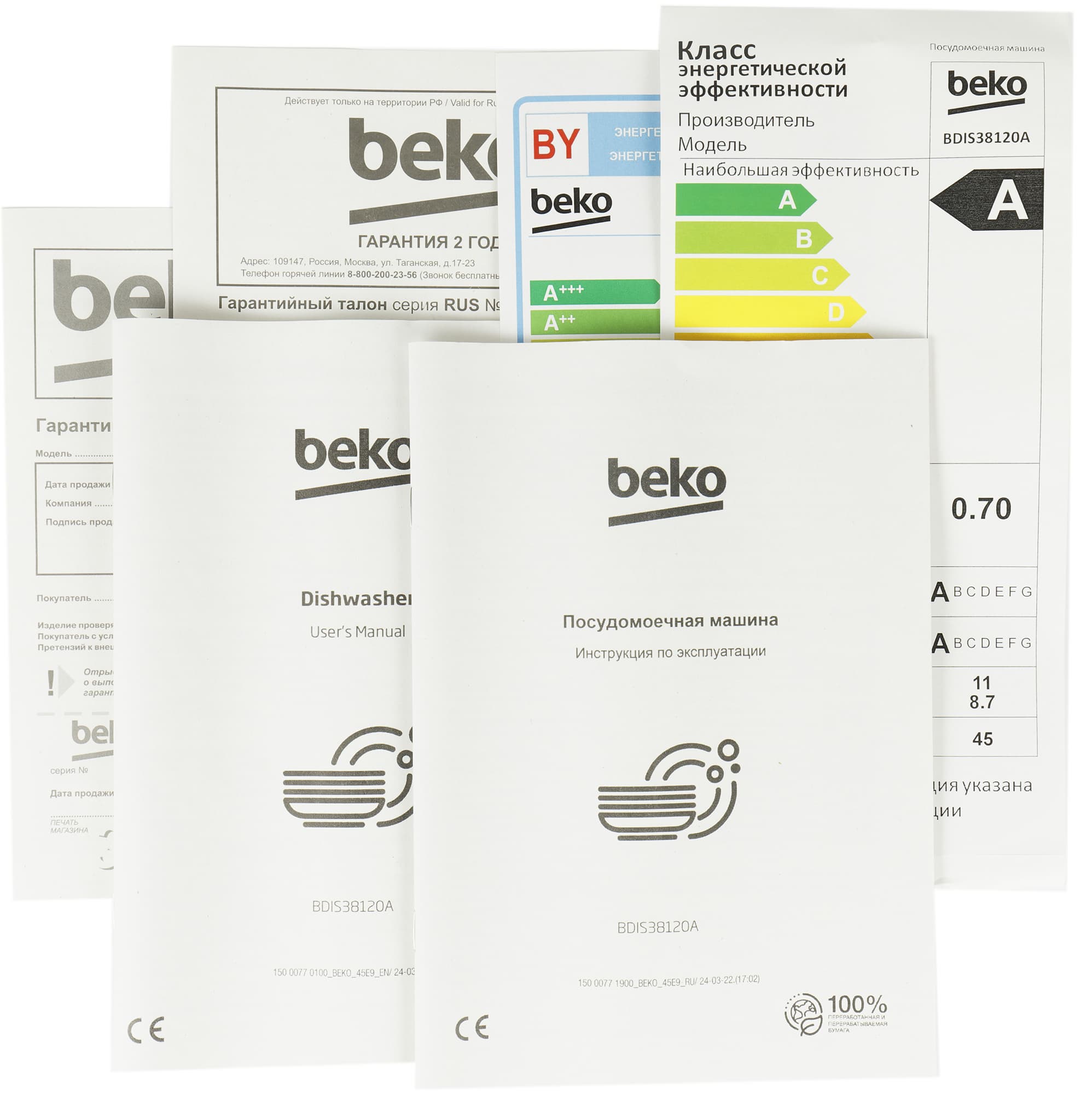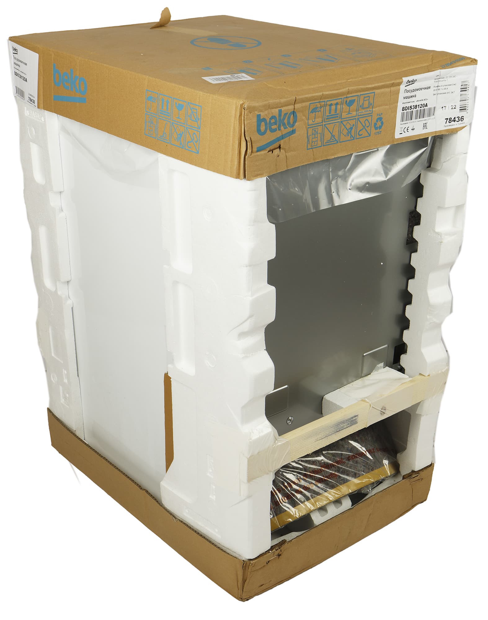 Посудомоечная машина Beko BDIS38120A поставляется в упаковке из пенопласта и картона, обтянутой толстым полиэтиленом. Дополнительную жесткость конструкции придают деревянные рейки спереди и сзади.
