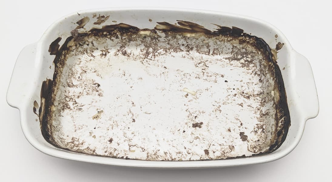 Для самого мощного режима мы опять сделали мясную запеканку под сметанным соусом. Некоторые готовят в таких случаях мясо по-французски под майонезом, но мы не можем выкидывать такое количество еды. Керамическую форму для запекания опустошили и вернули в горячую духовку примерно на 15 минут. Остатки жира и сметаны запеклись на стенках практически намертво.