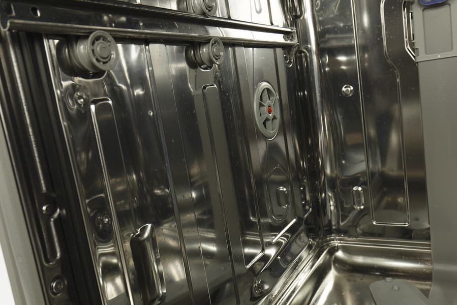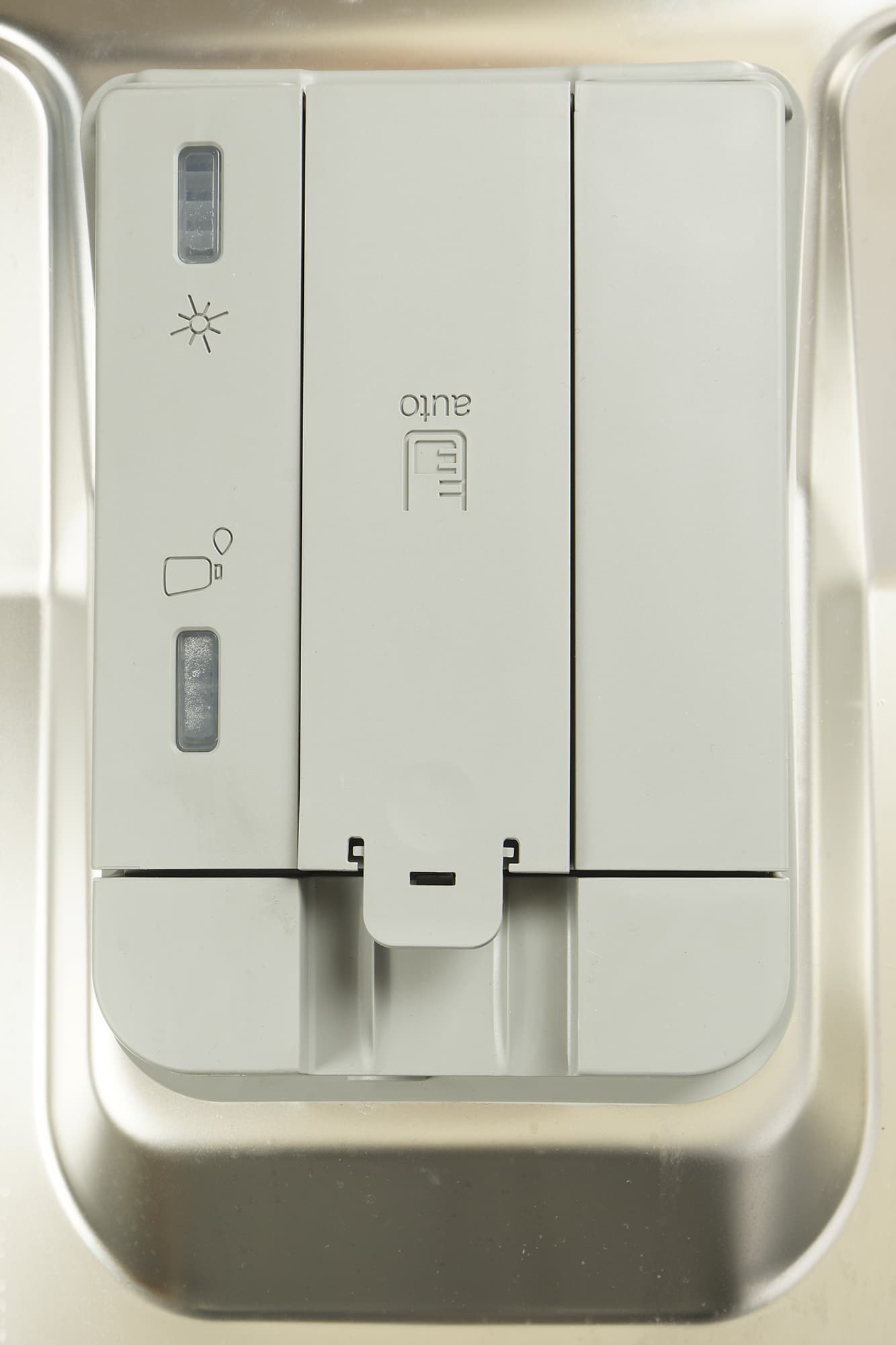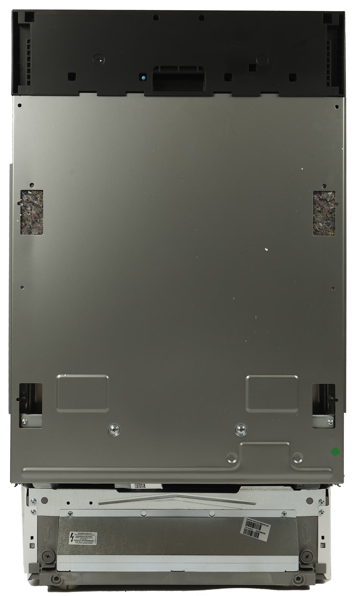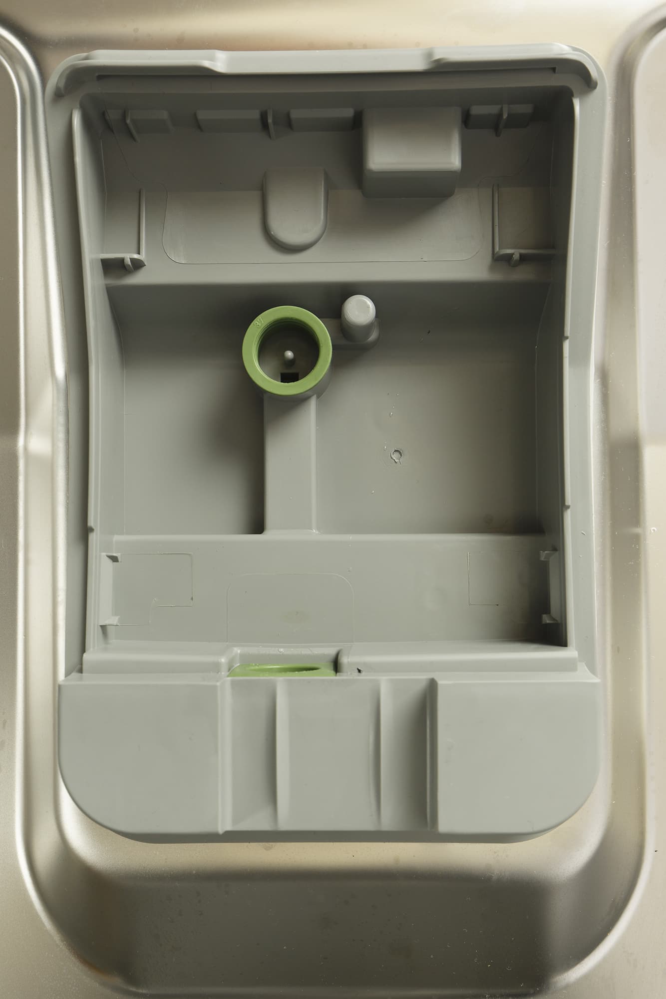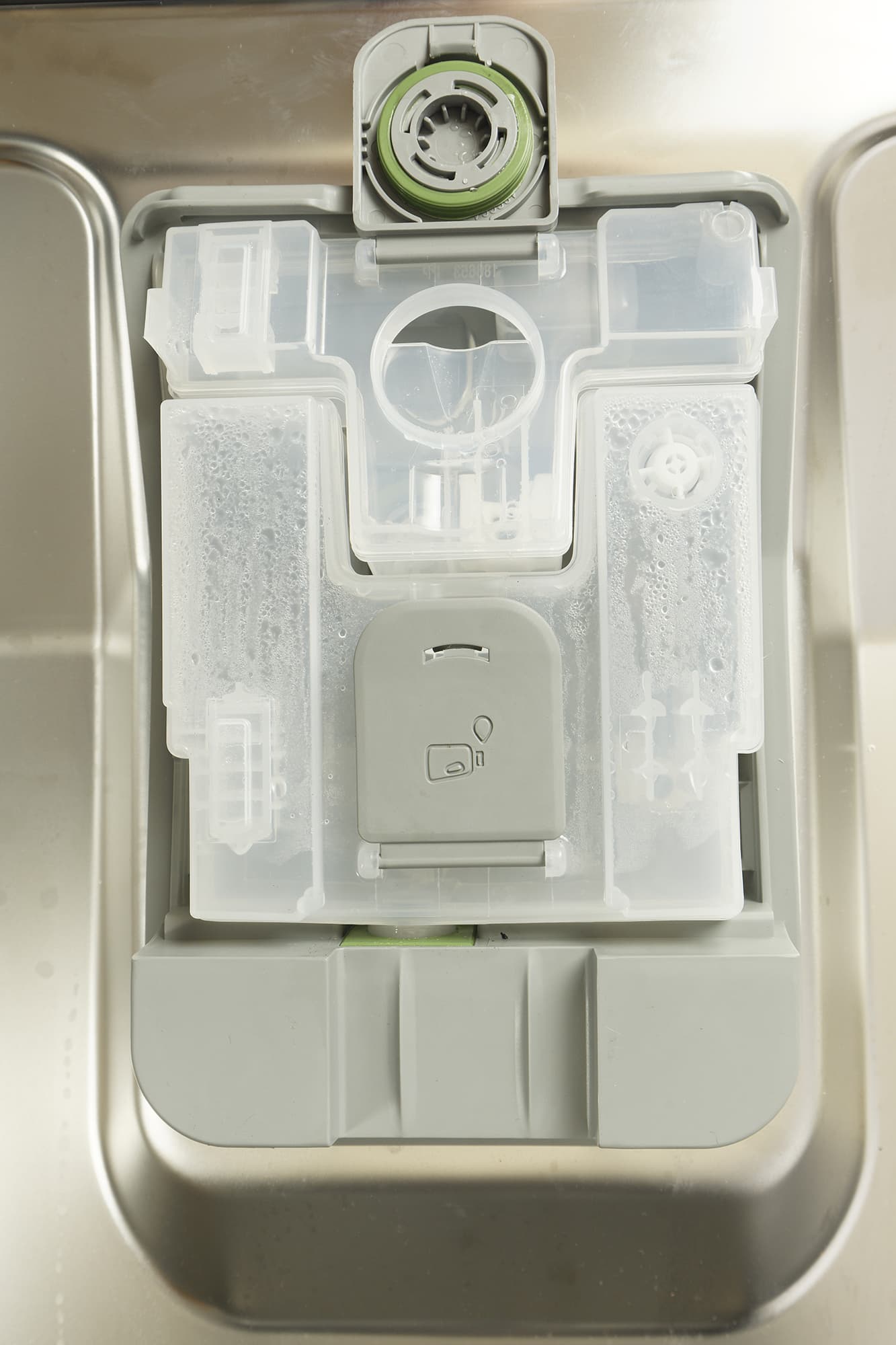 На дне бака из нержавеющей стали располагаются два распылителя: вращающийся (традиционной конструкции) и неподвижный, орошающий зону интенсивного мытья в правой части емкости. Здесь же находятся горловина емкости смягчителя, в которую засыпают соль, и съемный фильтр. Специальная наклейка на дне напоминает о необходимости активировать функцию автодозировки: по умолчанию она выключена.