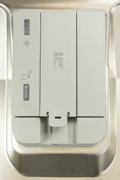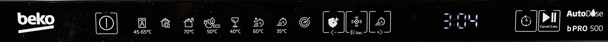 В левой части здесь мы видим сенсорные кнопки включения и выбора программ. Чуть правее — инструменты управления дополнительными режимами стирки, а рядом с ними — светодиодный дисплей, на котором отображаются время выполнения цикла с выбранными опциями и возможные сообщения об ошибках. Две кнопки справа отвечают за отложенный старт и позволяют запустить или приостановить мытье посуды.