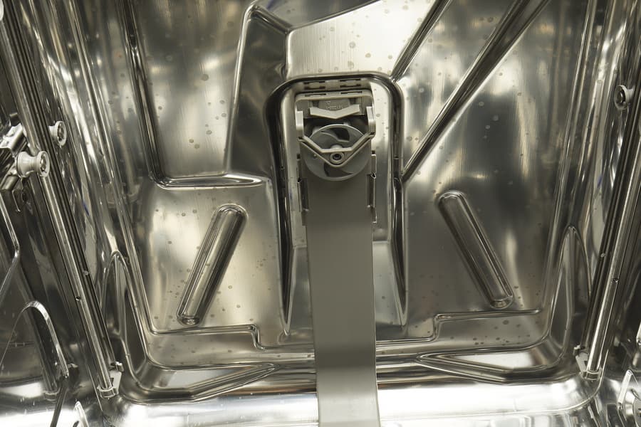 Посуда в средней корзине орошается из разбрызгивателя, размещенного под ней. Для мытья столовых приборов на верхней полке служит вращающаяся форсунка на «потолке» бака. Рядом с ней — плафон подсветки, которая включается при открытии дверцы.