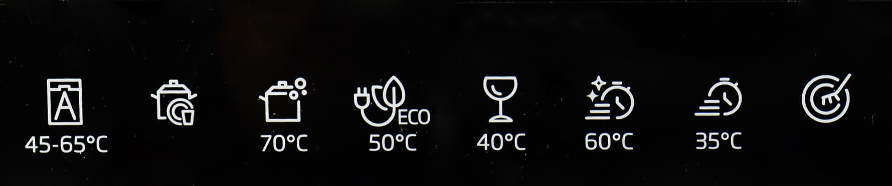 | Eco | Предназначена для мытья посуды с обычным уровнем загрязнения, это наиболее эффективная программа, объединяющая мощность и оптимизированный расход воды (стандартный сценарий для оценки соответствия требованиям Директивы ЕС об экодизайне) | 184 | 50 |